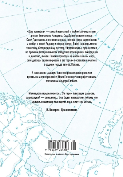 "Two Captains" is Veniamin Kaverin's most famous and beloved novel. The story of its protagonist, Sani Grigoriev, according to the author, is "full of toil, inspiration, and love for his homeland and his work." It encompasses a difficult, homeless childhood, the hardships of war, a journey to the Far North in search of a mysteriously vanished expedition, and, of course, love.