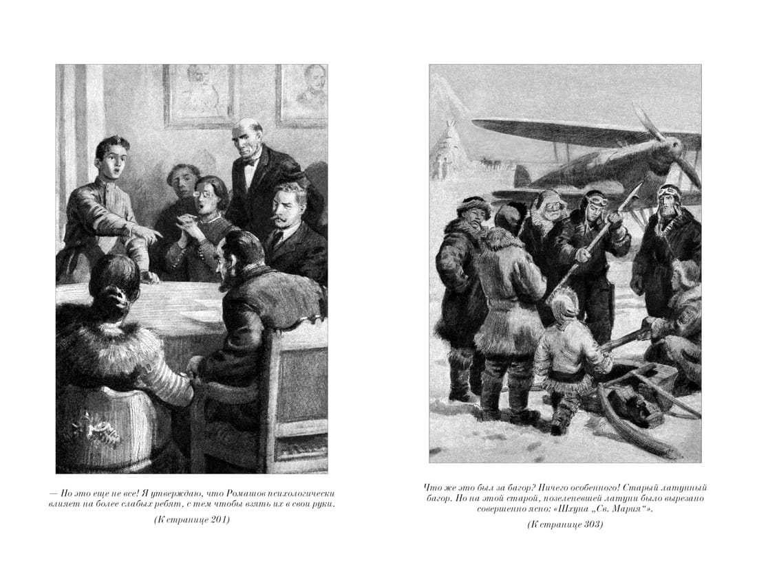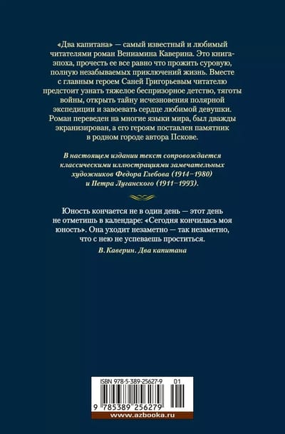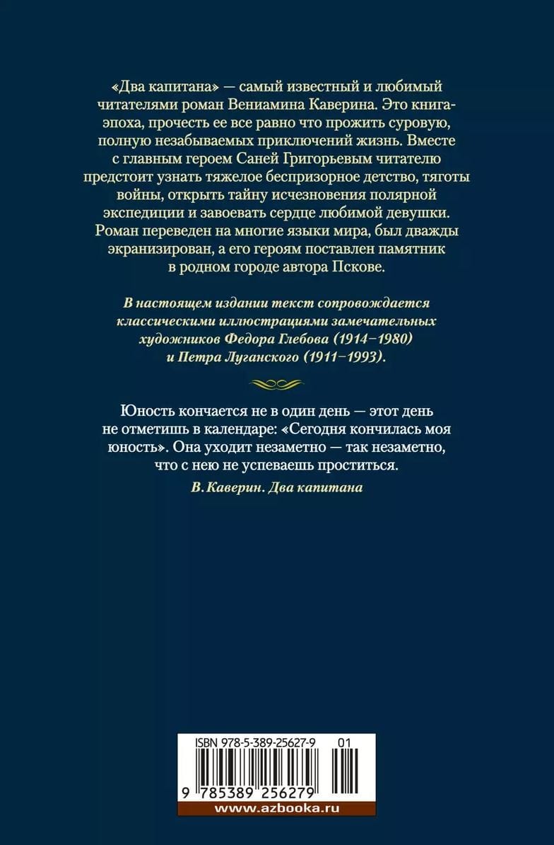 "Two Captains" is the most famous and beloved novel by Veniamin Kaverin. This is a book of an era, reading it is like living a harsh life full of unforgettable adventures. Together with the main character Sanya Grigoriev, the reader will have to survive a difficult homeless childhood, the hardships of war, discover the secret of the disappearance of a polar expedition and win the heart of his beloved girl. The novel has been translated into many languages, was filmed twice, and a monument to its heroes was erected in the author's hometown of Pskov. In this edition, the text is accompanied by classic illustrations by the remarkable artists Fyodor Glebov (1914-1980) and Pyotr Lugansky (1911-1993).