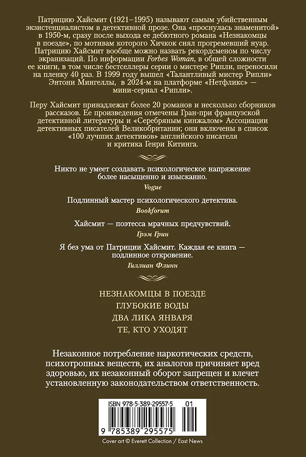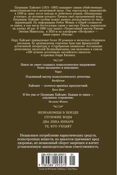 "Whether you like detective stories or not, Deep Water is essential reading" (Sunday Times). The hero, tired of his wife's infidelity, one day invents a murder story... The novel was adapted for the screen in 1981 and 2022 (directed by Adrian Lyne, starring Ben Affleck).