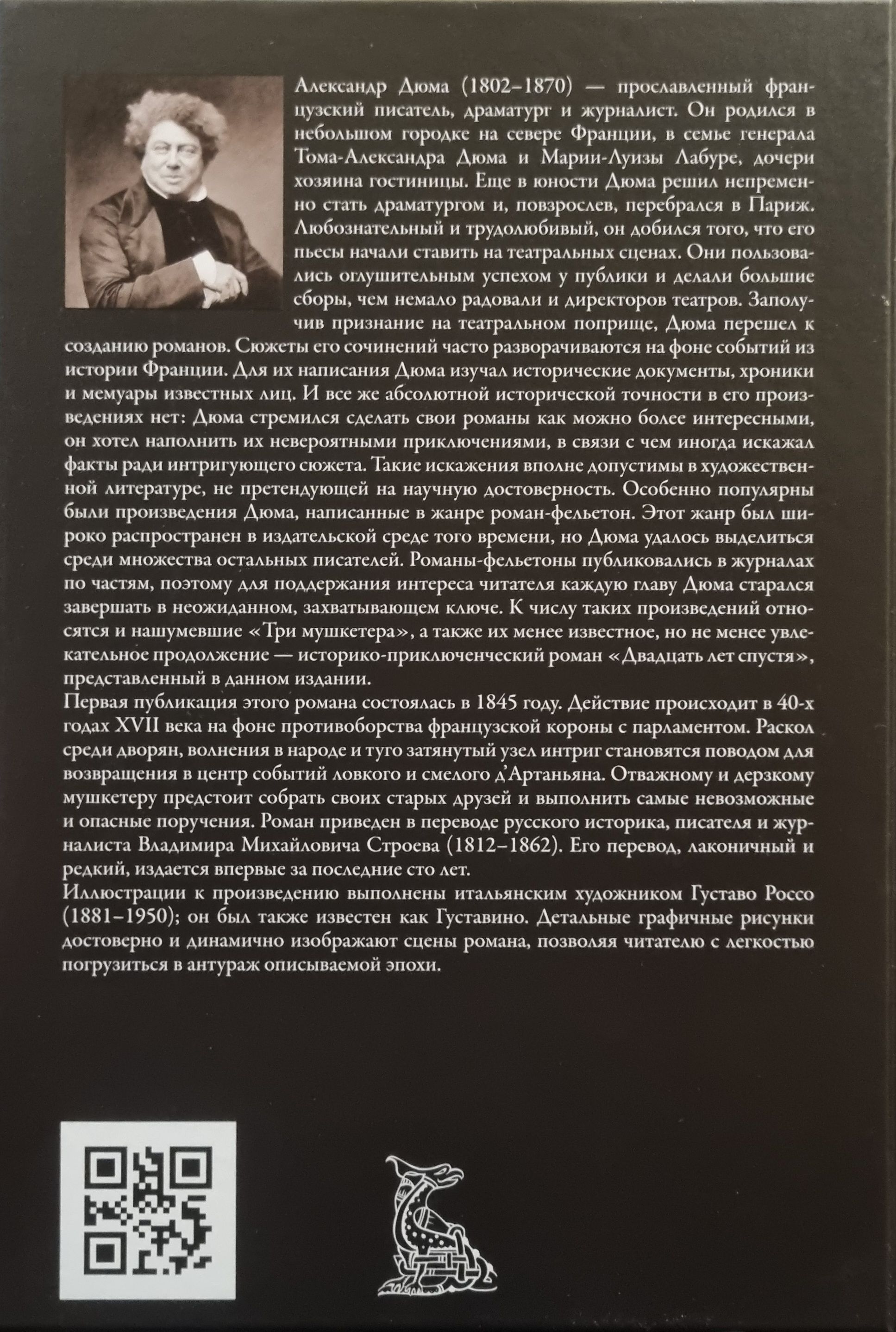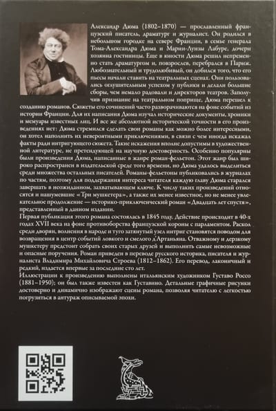 The novel was first published in 1845. The action takes place in the 1640s against the backdrop of the confrontation between the French crown and parliament. A split among the nobility, unrest among the people, and a tightly drawn knot of intrigue become the reason for the clever and courageous d'Artagnan to return to the center of events. The brave and daring musketeer will have to gather his old friends and carry out the most impossible and dangerous missions. The novel is translated by the Russian historian, writer, and journalist Vladimir Mikhailovich Stroyev (1812-1862). His translation, laconic and rare, is published for the first time in the last hundred years.