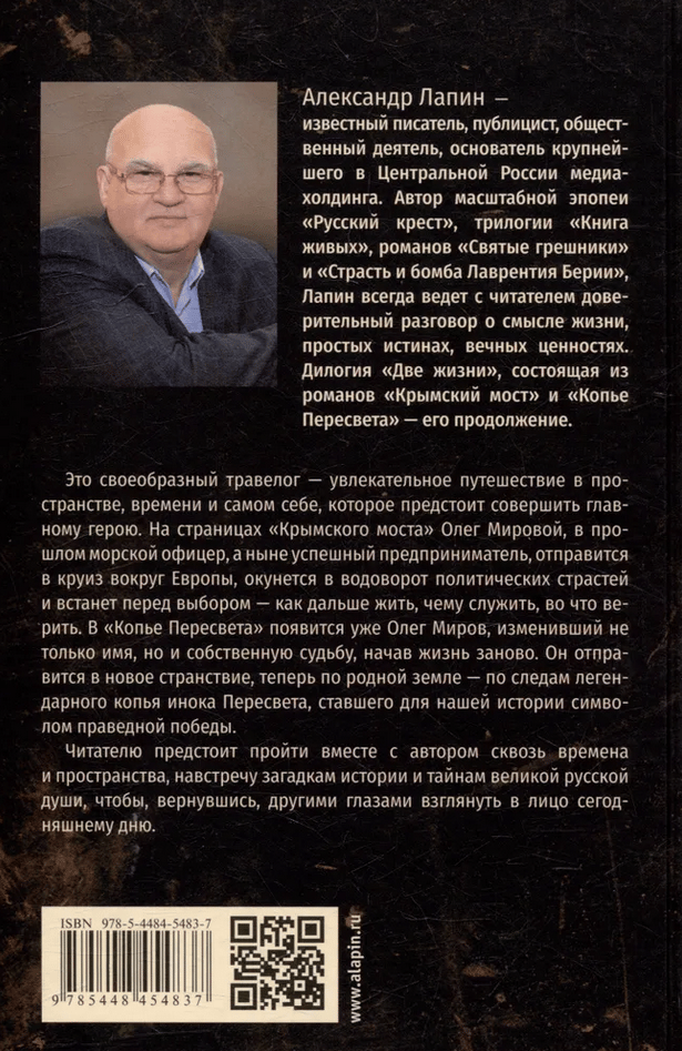 The author characterizes the novels "The Crimean Bridge" and "The Spear of Peresvet," which form the travelogue duology "Two Lives," as a journey through space, time, and the depths of the human soul. Whether the protagonist embarks on a cruise around Europe or a pilgrimage to Russian holy sites, he will embark on the arduous path of spiritual quest. A strong-willed and determined man, capable of withstanding adversity and making difficult decisions, he will embark on a quest for Truth and his true self.