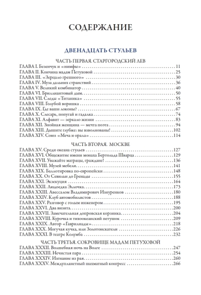 In Soviet times, two famous novels by Ilya Arnoldovich Ilf (1897–1937) and Yevgeny Petrovich Petrov (1902–1942), The Twelve Chairs and The Little Golden Calf, were repeatedly edited, changed, and cut. This edition reproduces the full texts of these novels from their first book publications. At the end of the edition, there is the story The Past of the Civil Registry Office Registrar, which is an unpublished chapter from the novel The Twelve Chairs; it was first published in the magazine 30 Days in 1929. The book is decorated with illustrations by the Kukryniksy brothers; more than three dozen of their additional illustrations and design elements for the first editions of The Twelve Chairs are also provided.