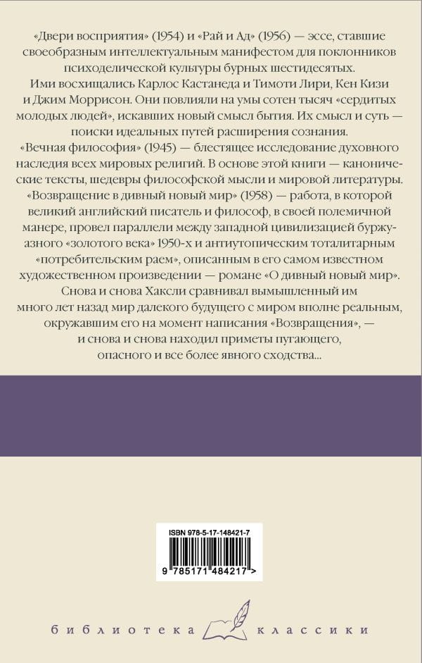 The Doors of Perception (1954) and Heaven and Hell (1956) are essays that became a kind of intellectual manifesto for fans of the psychedelic culture of the turbulent sixties. They were admired by Carlos Castaneda and Timothy Leary, Ken Kesey and Jim Morrison. They influenced the minds of hundreds of thousands of "angry young people" searching for a new meaning of existence. Their meaning and essence is the search for ideal ways to expand consciousness. "Eternal Philosophy" (1945) - a brilliant study of the spiritual heritage of all the world's religions. This book is based on canonical texts, masterpieces of philosophical thought and world literature. "Return to a Wonderful New World" (1958) - a work in which the great English writer and philosopher, in his polemical manner, drew parallels between the Western civilization of the bourgeois "golden age" of the 1950s and the dystopian totalitarian "consumer paradise" described in his most famous work of fiction - the novel "O Wonderful New World". Again and again Huxley compared the world of the distant future that he had fictionalized many years ago with the very real world that surrounded him at the time of the writing of The Return - and again and again he found signs of frightening, dangerous and increasingly obvious similarities....