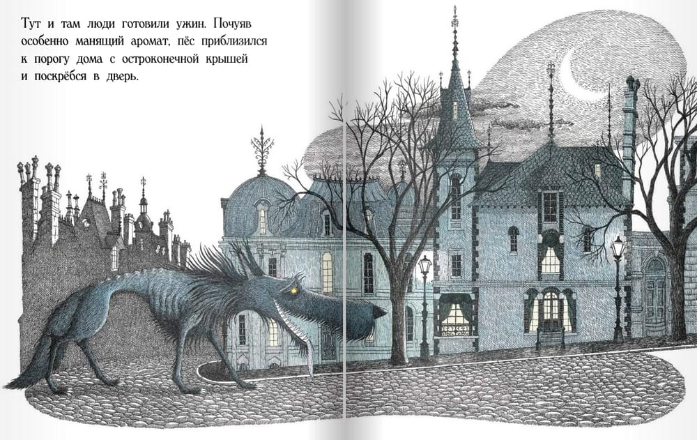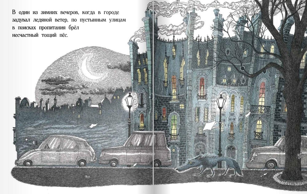 In the deserted streets of the city, blown by cold winds, a poor hungry dog wanders in search of food and warmth.