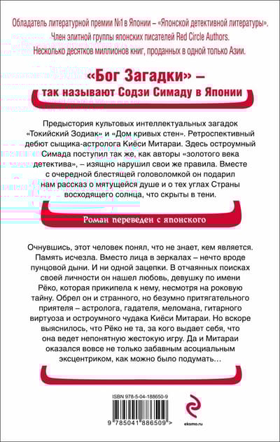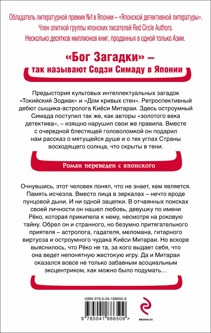 The backstory of astrologer detective Kiyoshi Mitarai, the protagonist of the puzzle novels "Tokyo Zodiac" and "House of Crooked Walls". Tokyo, 1978. A certain man came to his senses on a bench in a completely unfamiliar place and gradually realized that he remembers nothing about his past life and doesn't know who he is at all. In addition, he found that instead of his face he saw in the mirrors something like a crimson melon. In a hopeless situation, a girl named Ryoko came to his aid, they fell in love and settled down together. The unknown man took the name Keisuke Ishikawa. Seeing no other attempt to find out something about himself, he turned to the odd astrologer Kiyoshi Mitarai, making friends with him. But it wasn't the stars that helped, it was chance: Keisuke found the first clue. In Ryoko's things. Using this key, he made a waterfall of shocking discoveries. And only Mitarai, who has powers Keisuke never realized he had, will be able to make sense of them....