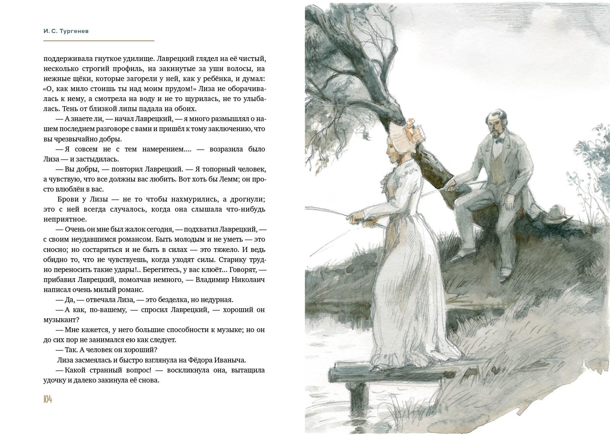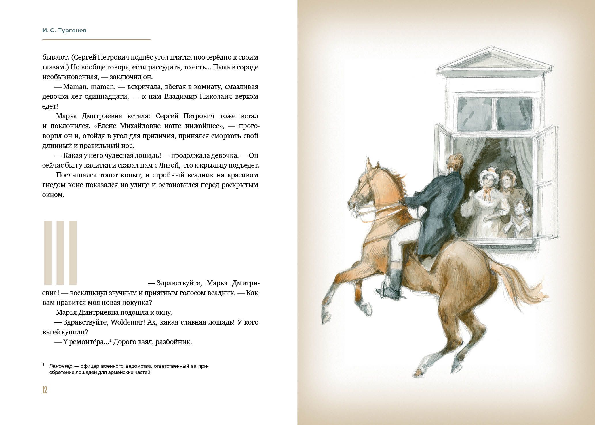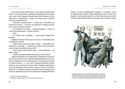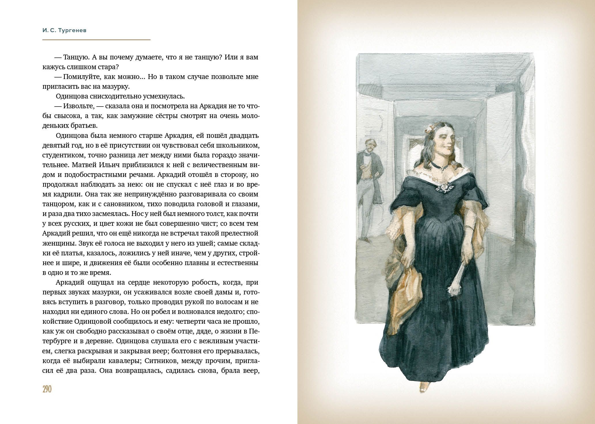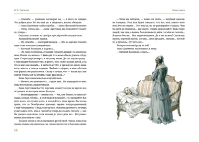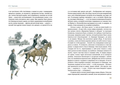 Included in the proposed collection of works recreate a bright and vivid picture of the Russian reality of 1830-1860 years. The novel "Nest of the Nobility" familiarizes us with the image of the aristocracy of those years and is devoted to the dramatic love story of the two main characters - Fyodor Lavretsky and young Lisa Kalitina. In his novel Fathers and Children, Turgenev explores the interaction and clash of two cultures through the conflict between two generations, Pavel Petrovich Kirsanov and Evgeny Bazarov - the old, conservative nobility and the new, rapidly developing stratum of Dissenters-Democrats, bearers of progressive ideas. The story "First Love", based on the life experience of the writer himself, with all the acuteness of the feelings and mental experiences of the young hero in love, sixteen-year-old Vladimir. "This is the only thing," Turgenev recalled, "which I myself still enjoy, because it is life itself, it is not composed .... 'First Love' - it is experienced." The book is illustrated by Anatoly Zinovievich Itkin, an outstanding master of Russian book illustration.