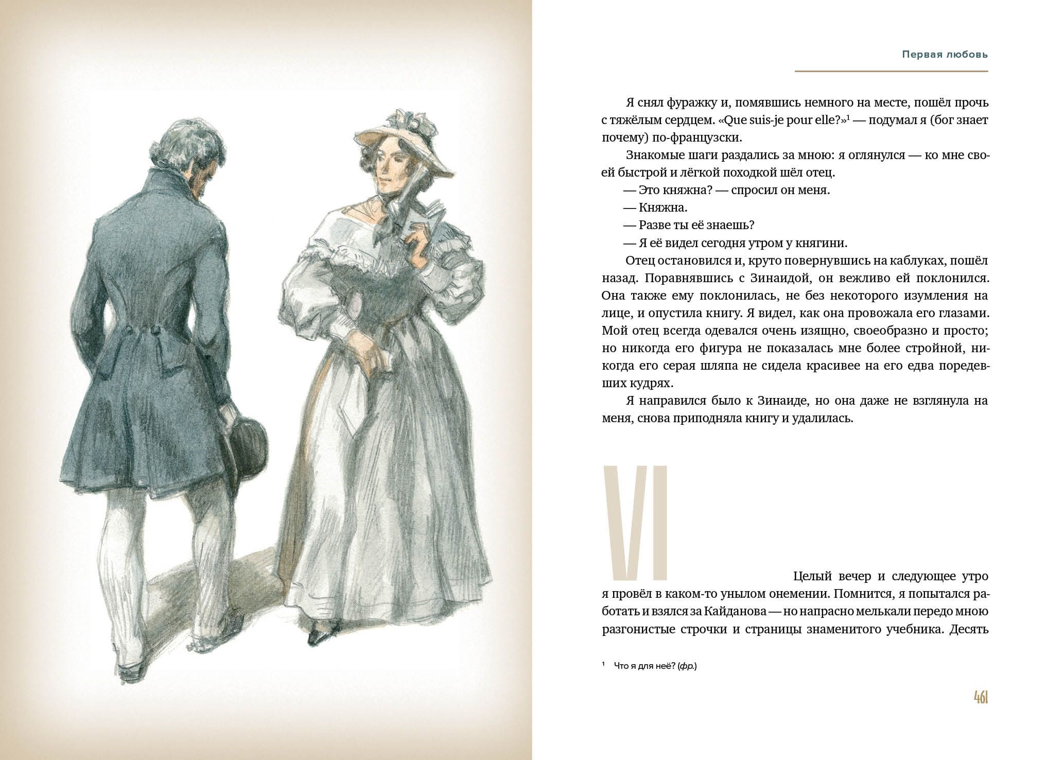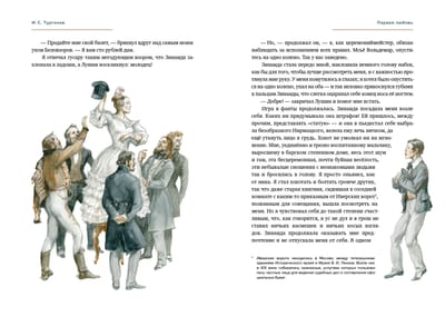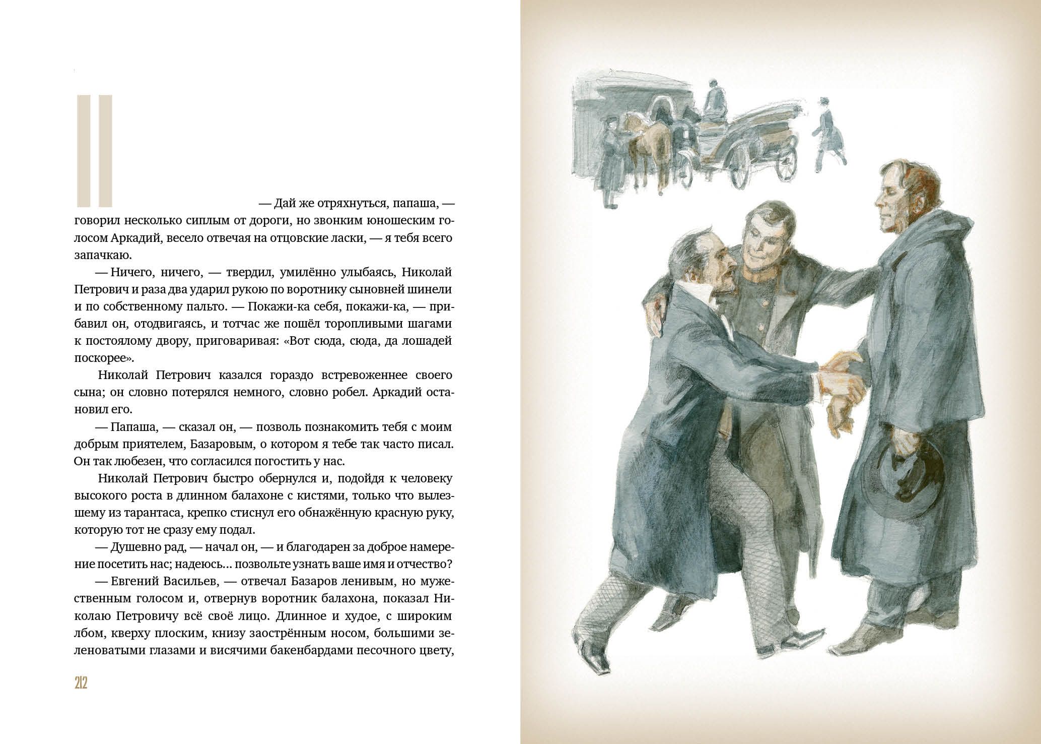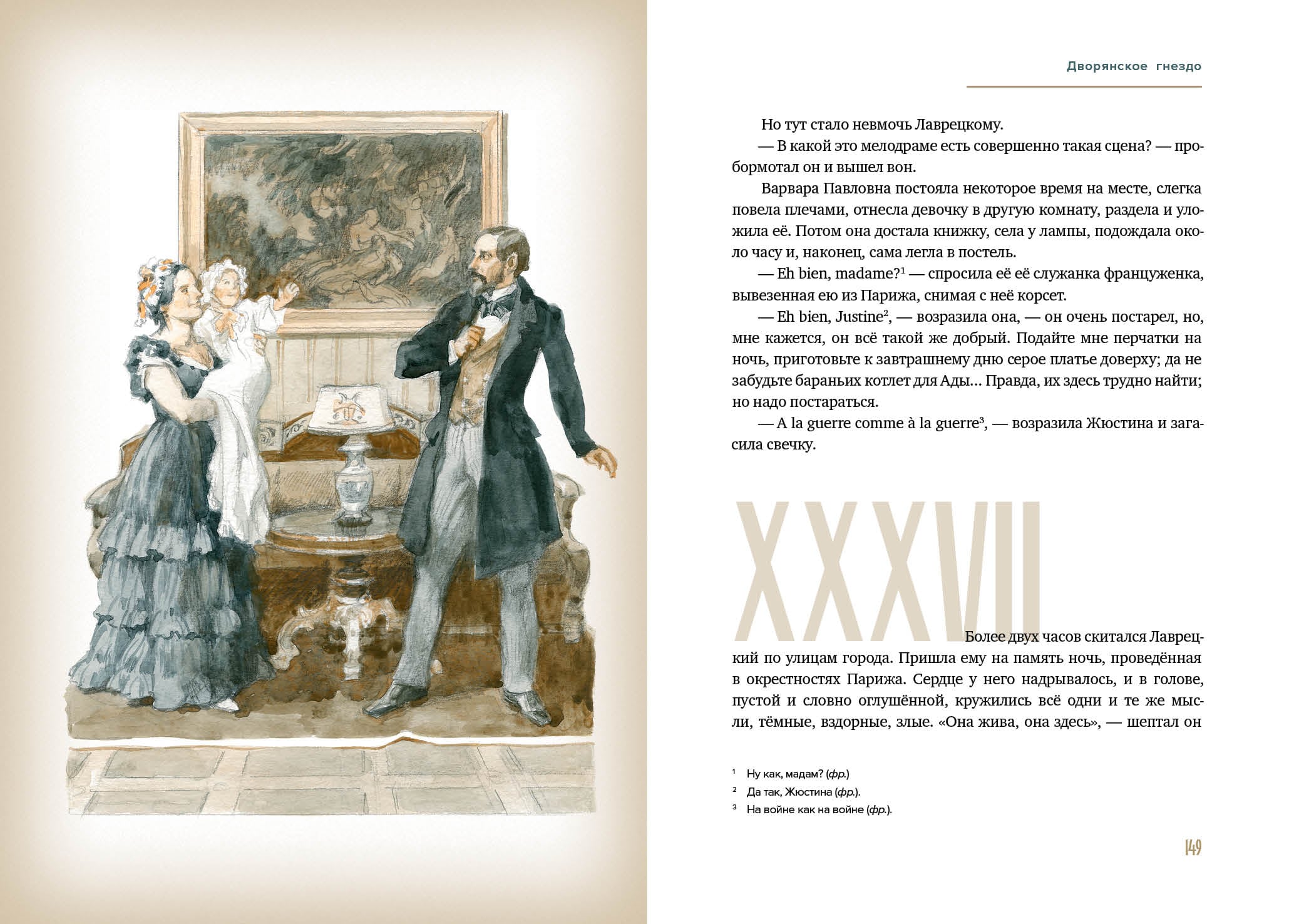 Included in the proposed collection of works recreate a bright and vivid picture of the Russian reality of 1830-1860 years. The novel "Nest of the Nobility" familiarizes us with the image of the aristocracy of those years and is devoted to the dramatic love story of the two main characters - Fyodor Lavretsky and young Lisa Kalitina. In his novel Fathers and Children, Turgenev explores the interaction and clash of two cultures through the conflict between two generations, Pavel Petrovich Kirsanov and Evgeny Bazarov - the old, conservative nobility and the new, rapidly developing stratum of Dissenters-Democrats, bearers of progressive ideas. The story "First Love", based on the life experience of the writer himself, with all the acuteness of the feelings and mental experiences of the young hero in love, sixteen-year-old Vladimir. "This is the only thing," Turgenev recalled, "which I myself still enjoy, because it is life itself, it is not composed .... 'First Love' - it is experienced." The book is illustrated by Anatoly Zinovievich Itkin, an outstanding master of Russian book illustration.