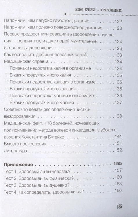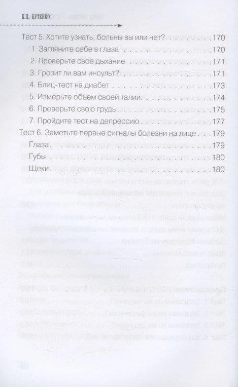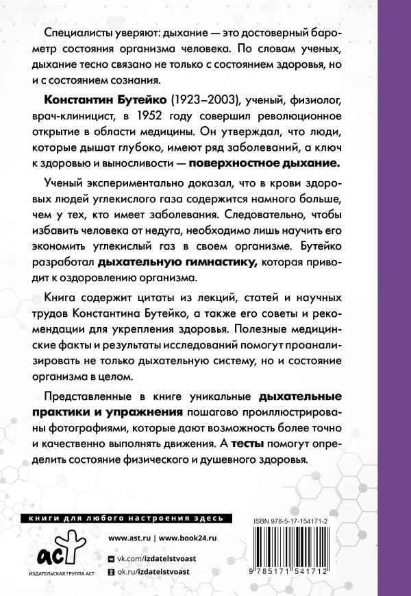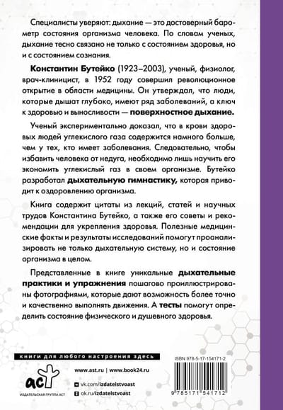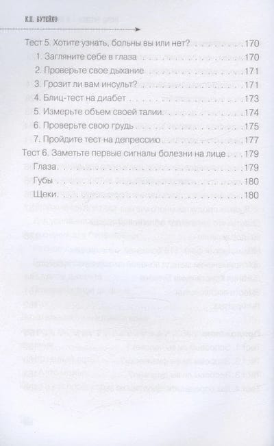 Specialists assure: breathing is a reliable barometer of the state of the human body. According to scientists, breathing is closely interconnected not only with the state of health, but also with the state of consciousness. Konstantin Buteyko (1923-2003), scientist, physiologist, clinician, in 1952 made a revolutionary discovery in the field of medicine. He argued that people who breathe deeply have a number of diseases, and the key to health and endurance is shallow breathing. The scientist experimentally proved that healthy people have much more carbon dioxide in their blood than those who have diseases. Consequently, to rid a person of a disease, it is only necessary to teach him to save carbon dioxide in his body. Buteyko developed breathing exercises that lead to the recovery of the body. The book contains quotations from lectures, articles and scientific works of Konstantin Buteyko, as well as his advice and recommendations for improving health. Useful medical facts and research results will help to analyze not only the respiratory system, but also the condition of the body as a whole. The unique breathing practices and exercises presented in the book are step-by-step illustrated with photographs, which allow you to perform the movements more accurately and efficiently. And the tests will help to determine the state of physical and mental health.