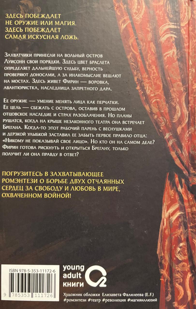 Firin is a thief, an adventurer, and the heir to a forbidden gift. Her weapon is the ability to change faces like gloves. Her goal is to escape the island, leaving behind her father's legacy and the fear of exposure. But her plans are ruined when she meets Bregan on the roof of an illegal theater.