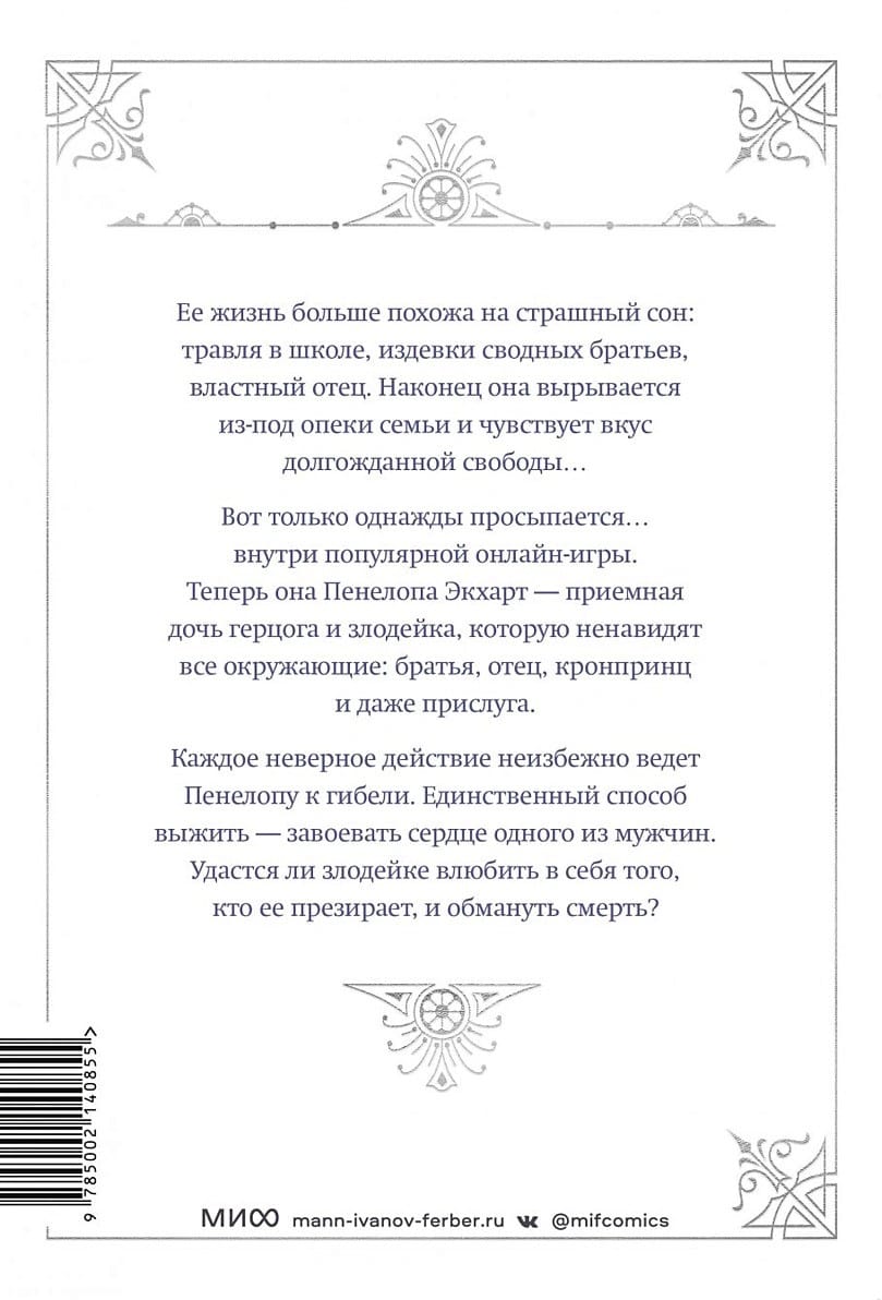 Not a moment's peace in a virtual world with crazy rules! Time is almost running out: Penelope Eckhart's coming of age is just days away, which means that soon the Duke's real daughter Yvonne will show up and.... and the villain will die a certain death. All hope for Iklis - his sympathy level has already reached ninety-nine percent. It seems that Penelope has the victory in her hands, but the unexpected act of the faithful slave confuses the girl all the cards. Feelings, which the villain took for love, turn out to be obsession ... Will Penelope cope with the new challenge, or all efforts were in vain?