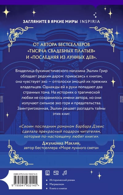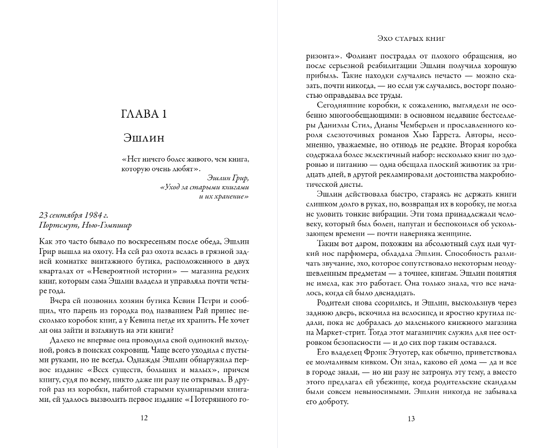 1984. The owner of a bookstore Ashlyn Greer has a rare gift: touching books, she feels an “echo” – echoes of the emotions of their former owners. One day, she gets her hands on two strange volumes telling of tragic love. Books do not have any output data or even the name of the author. They emit a strong echo of grief and betrayal. Intrigued Ashlyn decides to try to solve the mystery of the birth of these books.