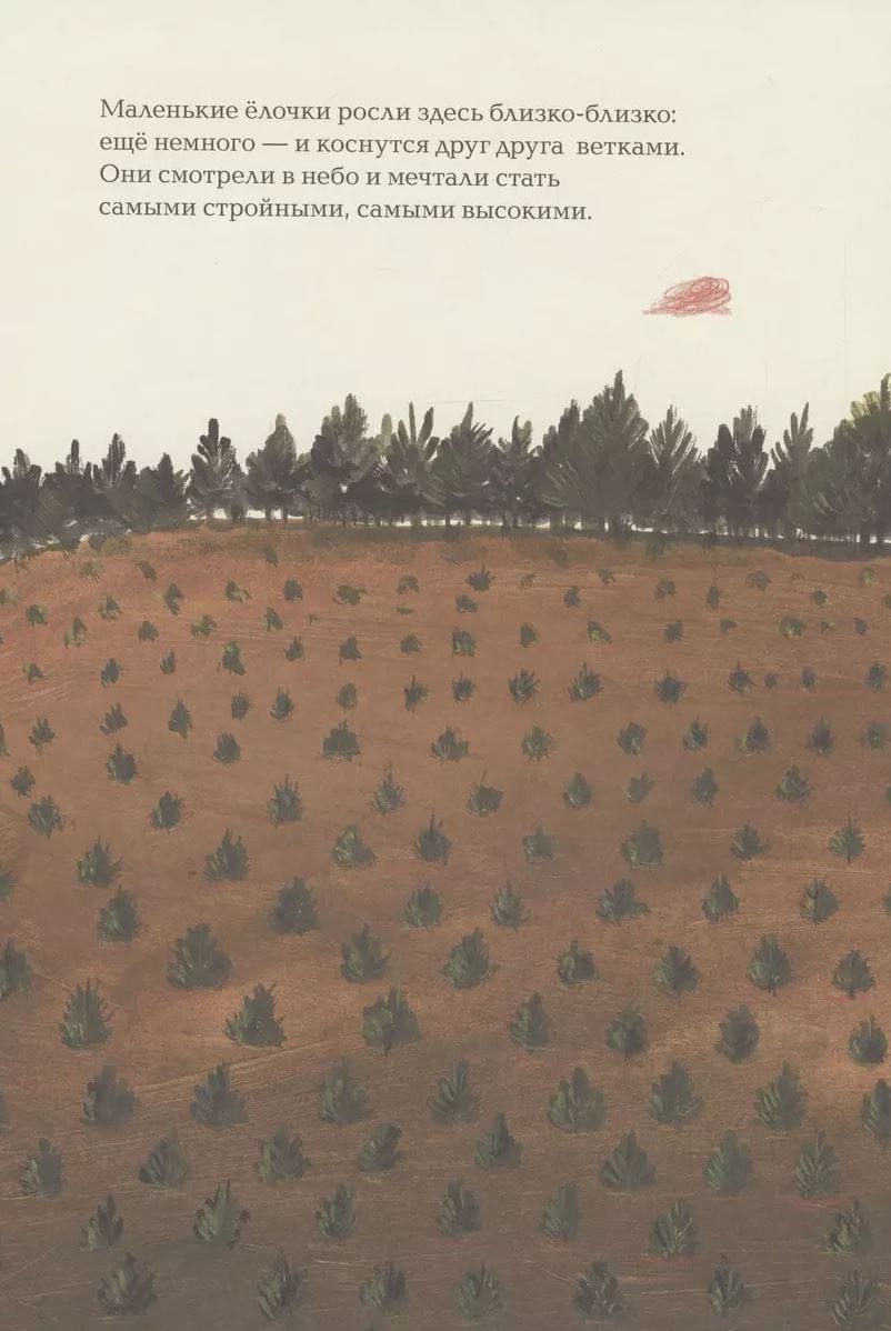 Yulka was born in a nursery on the edge of a highway. There, the Christmas trees grow so close that their branches almost touch each other. They look up to the sky and dream of growing the tallest, the slimmest, to get to some furniture factory. And Yulka's Christmas tree dreamed of lights and fireworks. She dreamed of its branches bending under the weight of balls and garlands, and a huge star shining on the top. Yulka wanted to be a Christmas tree.