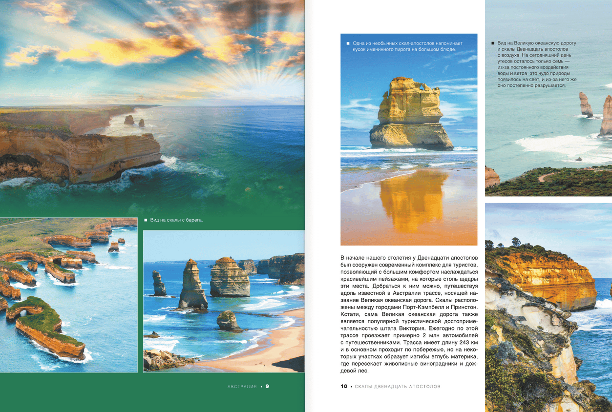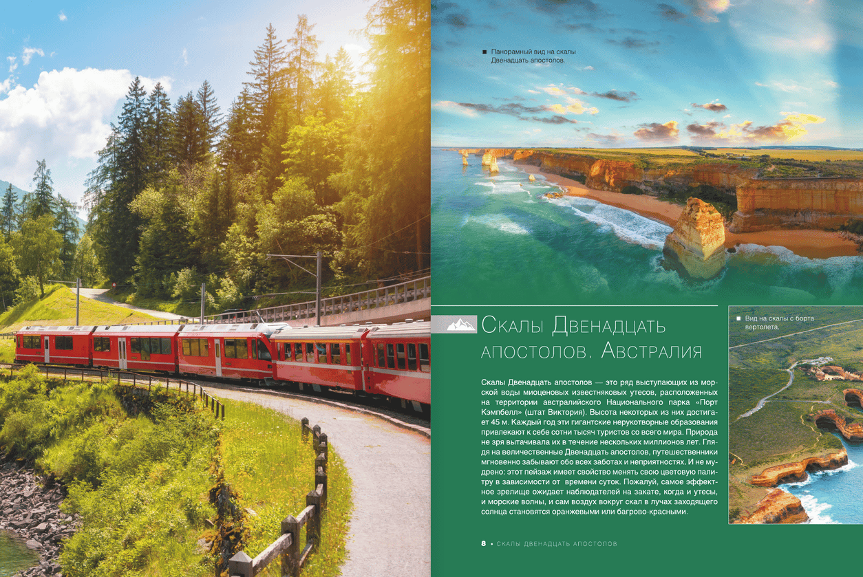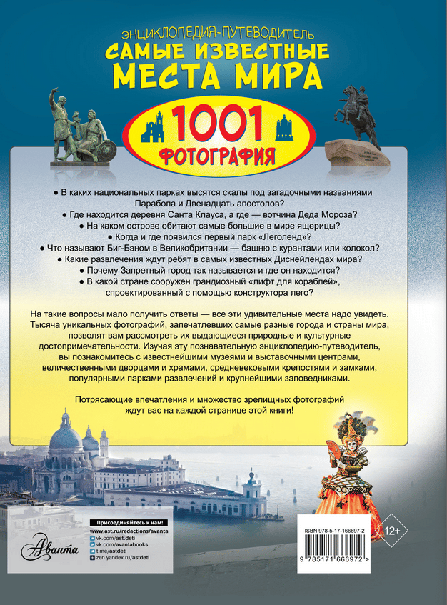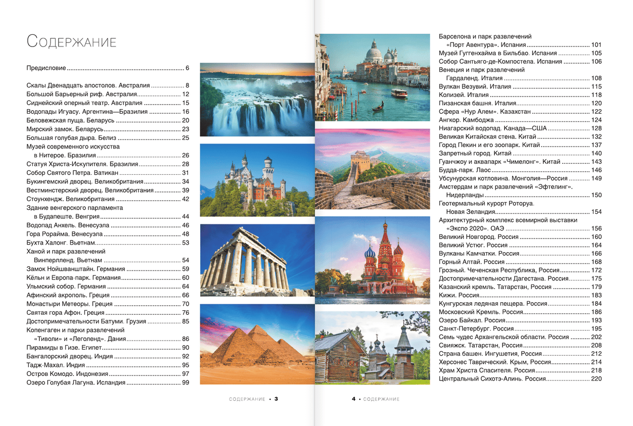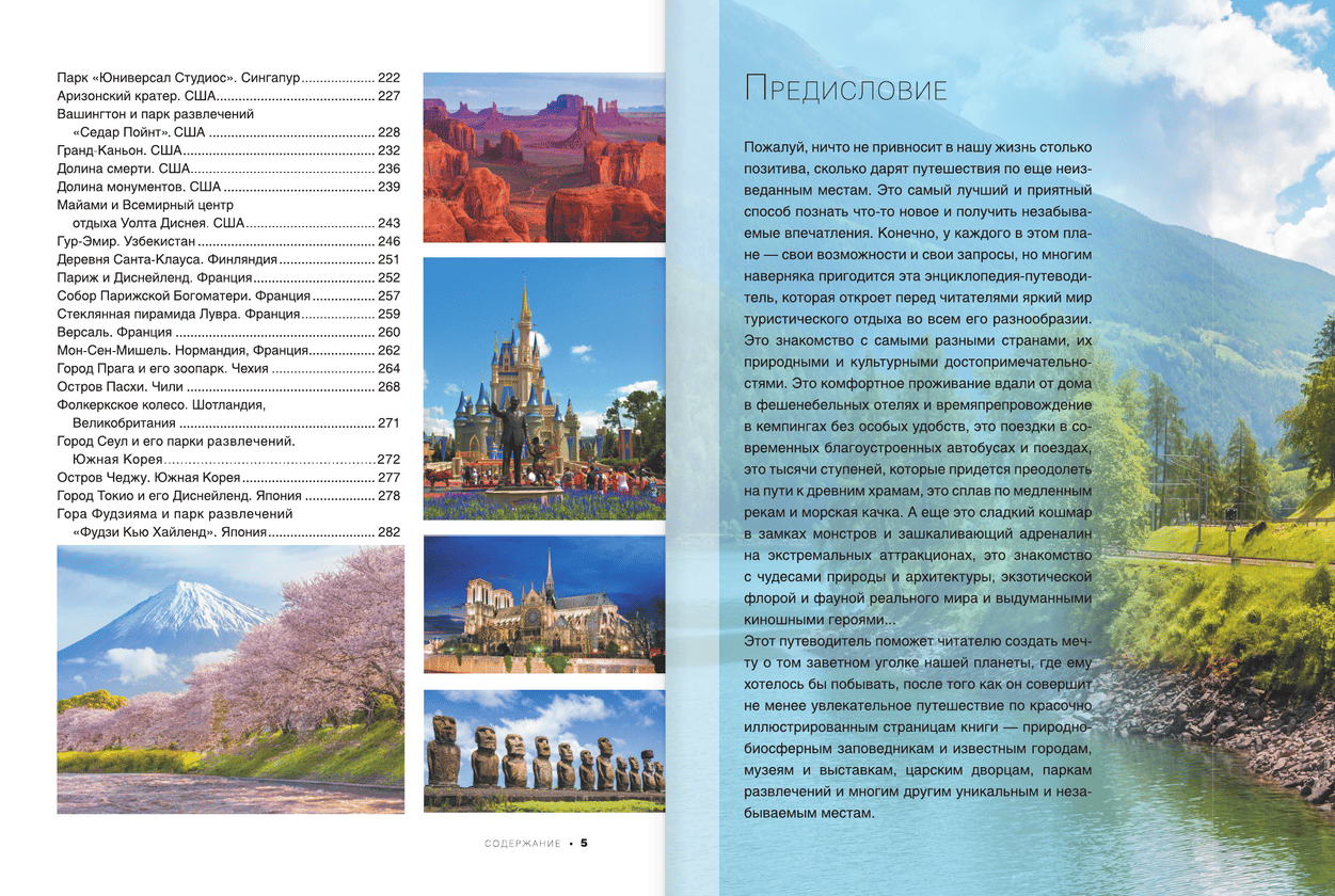 To choose a place for your upcoming trip, get to know the country you dream of visiting better, and learn more about its attractions, you don’t have to go to a travel agency, buy advertising brochures, or go on a long search on the Internet. Just open this encyclopedia-guide with 1000 exclusive photos — and dozens of interesting places in different countries of the world will appear before your eyes. You will be able to get to know the greatest cities of our planet, with their solemn squares and cozy streets, majestic palaces and temples, famous museums and exhibitions. You will be able to visit mysterious lost villages and ancient architectural complexes, look at the expanses of world-renowned natural and biosphere reserves with their highest mountain ranges and volcanoes, beautiful lakes and waterfalls, unique flora and fauna. Young readers will undoubtedly be attracted by the largest zoos, oceanariums, as well as popular amusement parks with dizzying rides and fantastic castles with animated characters from popular films and animations.
