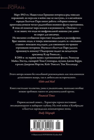 But suddenly, the messages become unintelligible. The enemy has changed the codes, making it impossible to track the "wolf packs" of German U-boats; this threatens enormous losses for the Allies. Has a spy really managed to infiltrate Bletchley Park? Suspicion falls on the mysterious beauty Claire Romilly...
