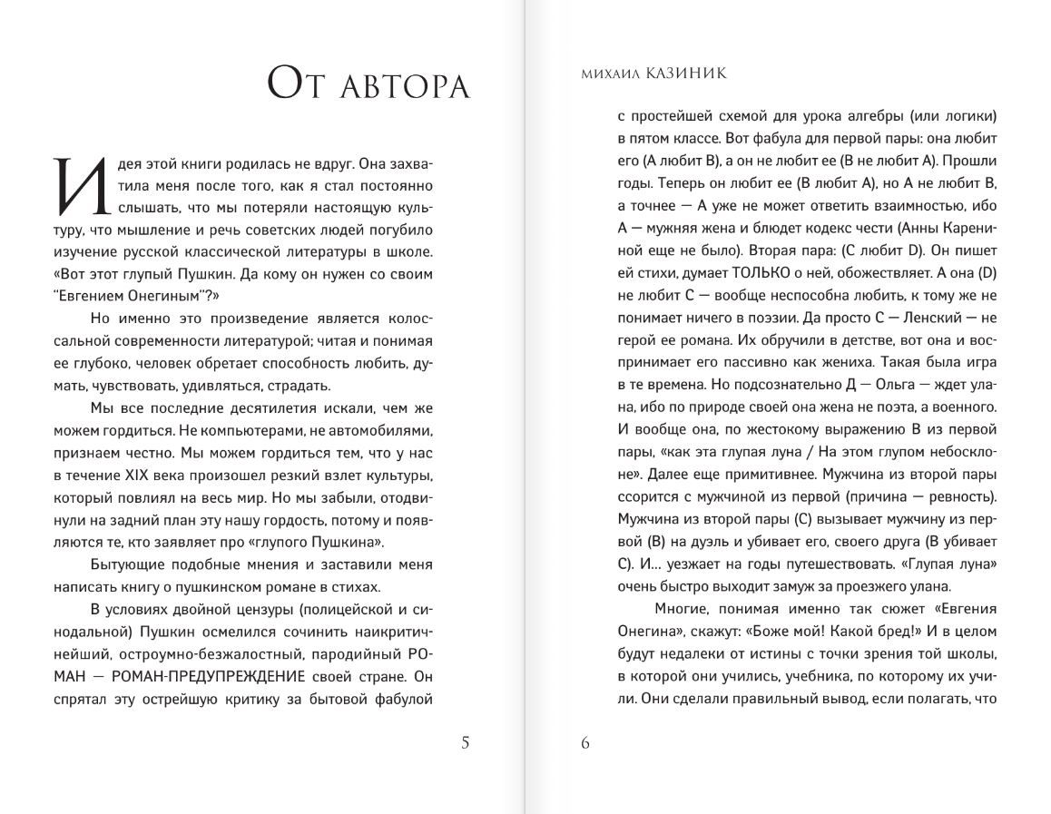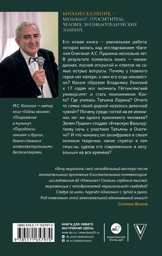 Mikhail Kazinik is a musician, educator, and a man of encyclopedic knowledge. His new book is a unique work that has been conducted on the study of A.S. Pushkin's "Eugene Onegin" for several years. The result is a book that is unexpected, full of discoveries and answers to the most pressing questions. Why does the main character have no mother, and his father's name is unknown? How could Vladimir Lensky graduate from the University of Gottingen by the age of 17 and become a fan of Kant? Where did Tatyana Larina study? Why did she "seem like a stranger in her own family"? Why is there not a single decent person among the guests at her name day? Why does Pushkin create Goethe's Walpurgis Night with the participation of Tatyana and Onegin? And what did he finally encrypt in his great creation, what meanings did he hide in it, making it modern and relevant for all times?