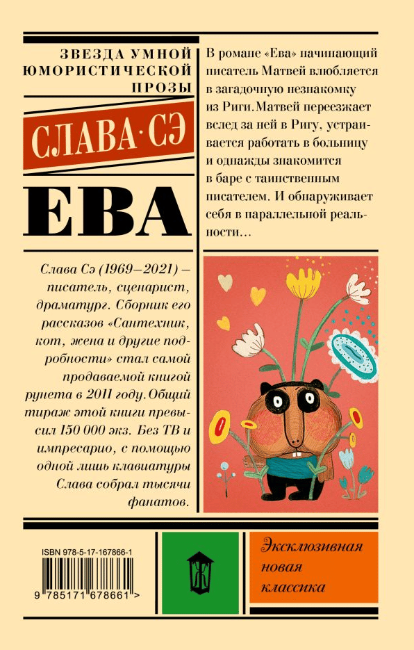 In the novel "Eva", an aspiring writer Matvey falls in love with a mysterious stranger from Riga. Matvey moves to Riga after her, gets a job in a hospital and one day meets a mysterious writer in a bar. And finds himself in a parallel reality...