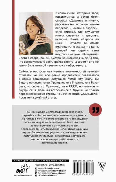 In her new book, Ekaterina Oaro, writer and author of the bestseller “Hold on and Write,” talks about her experience of moving and living in European countries, where many funny and sad stories happen. The book “Europe in Me” is partly about the experience of emigration, but always about the house that we build ourselves inside and out. About adaptability in today’s rapidly changing world. About the importance of getting to know yourself, standing firm on your own and at the same time being ready to change at any moment.