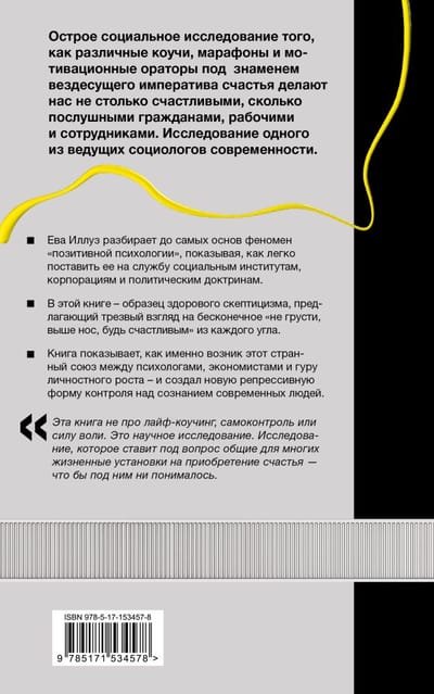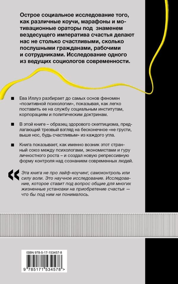 An incisive social study of how various coaches, marathons, and motivational speakers under the banner of the ubiquitous happiness imperative make us not so much happy as obedient citizens, workers, and employees. A study by one of today's leading sociologists. Eva Illouz strips the phenomenon of "positive psychology" down to its core, showing how easy it is to put it at the service of social institutions, corporations, and political doctrines. This book is a model of healthy skepticism, offering a sobering look at the endless "don't be sad, hold your nose, be happy" from every corner. The book shows exactly how this strange alliance between psychologists, economists, and personal growth gurus came about - and created a new repressive form of mind control for modern people.
