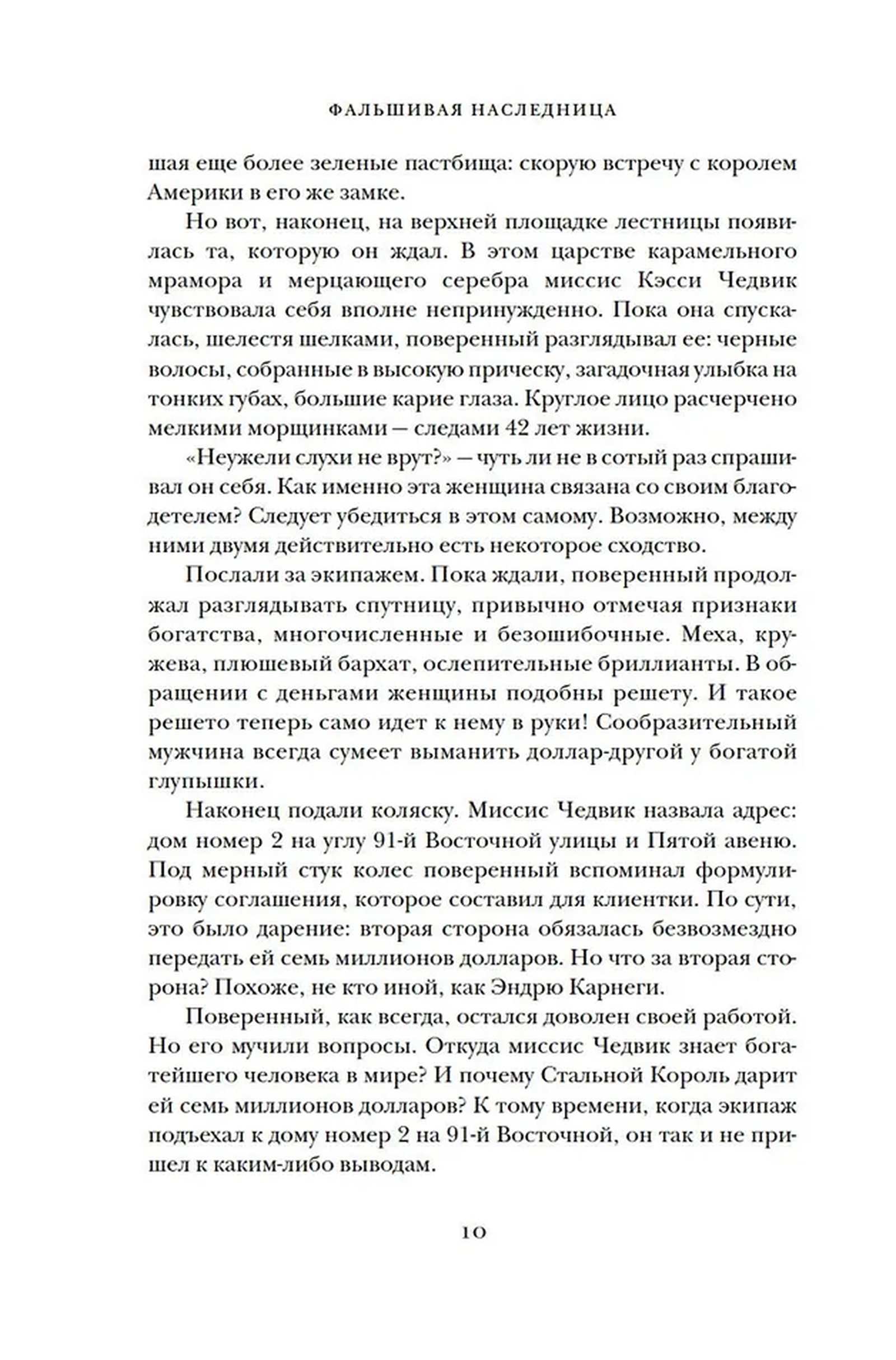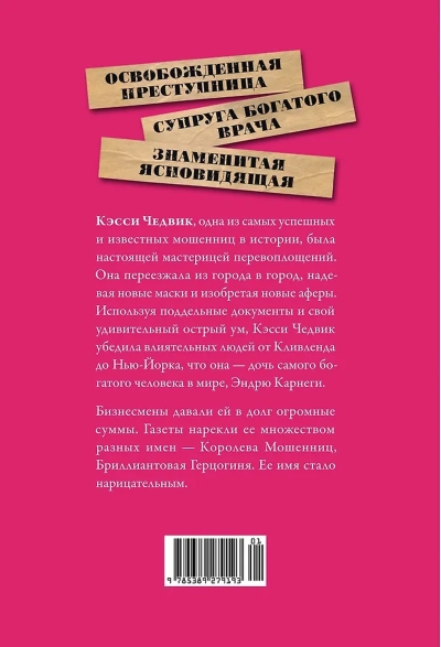 Elizabeth Bigley, a native of a small town in rural Canada, discovered a talent for persuasion and cunning deception at a young age. It was precisely this ability that would lead her to become one of the most notorious con artists in history. By changing names and inventing new ruses, Cassie Chadwick managed to survive for 14 years on loans backed by forged promissory notes, charming bankers one after another, and convincing everyone she was the daughter of the famous Andrew Carnegie. Author Annie Reed's book tells one of the most gripping stories about American society in the late 19th century.