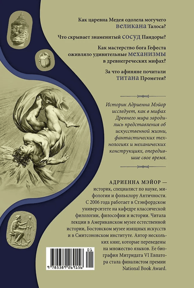 The “first” robot to walk the earth was the bronze giant Talos. Created by the ancient Greek god Hephaestus over 2,500 years ago, he guarded the island of Crete. The sculptor Pygmalion breathed life into the statue of Galatea, and the wonders of Daedalus have inspired people for centuries. Mythical automatons and innovative structures appear in Indian and Chinese, Greek and Roman legends long before the clockwork mechanisms of the Middle Ages and the development of science in the New Age. In this exciting and unusual book, historian Adrienne Mayor explores how the imagination of ancient people created amazing devices on the edge of myth and reality. Using a large body of sources, the author shows how Antiquity anticipated modern discoveries in the field of robotics and predicted the era of artificial intelligence, because from time immemorial science has been driven by imagination.