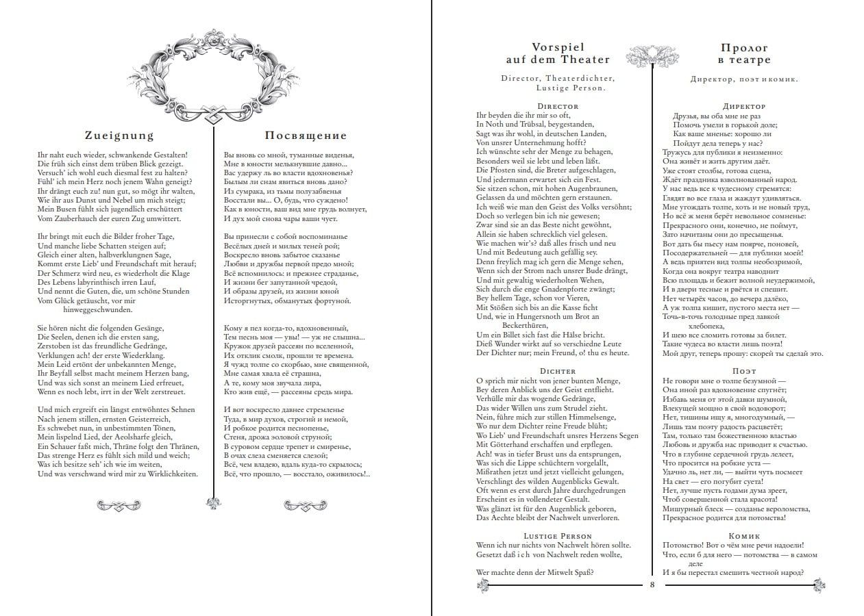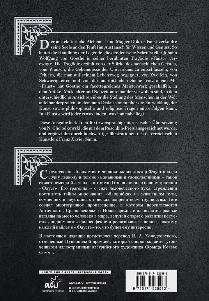 "Faust" is one of the greatest works of world literature. This edition presents Goethe's masterful tragedy in both the original and N. A. Kholodkovsky's translation. This book will be especially useful for those studying German and wanting to experience "Faust" in its original language: you can easily and quickly compare stanzas in both languages without the need for a dictionary. Its luxurious artwork makes it an excellent purchase for bibliophiles.