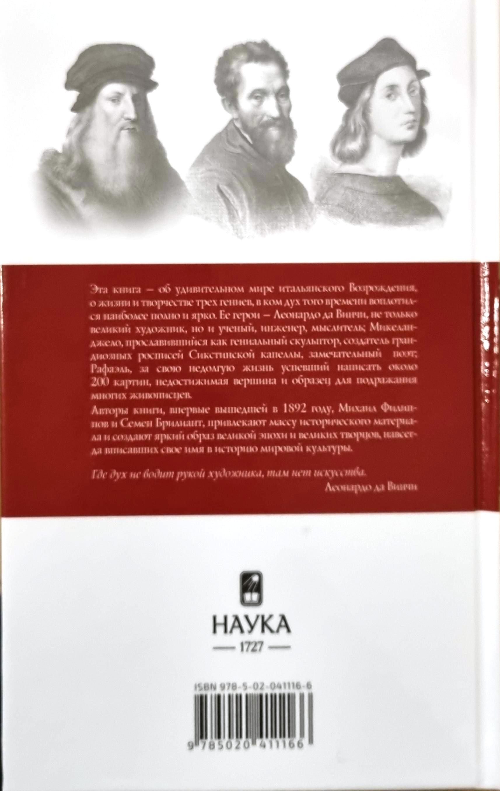 The authors of the book, writers M. M. Filippov and S. M. Brilliant, in an accessible and fascinating form talk about the life and work of three great masters of the Italian Renaissance - Leonardo da Vinci, Raphael and Michelangelo. First published by the St. Petersburg publisher F.F. Pavlenkov at the end of the XIX century, the collection became a real classic of Russian journalism.
