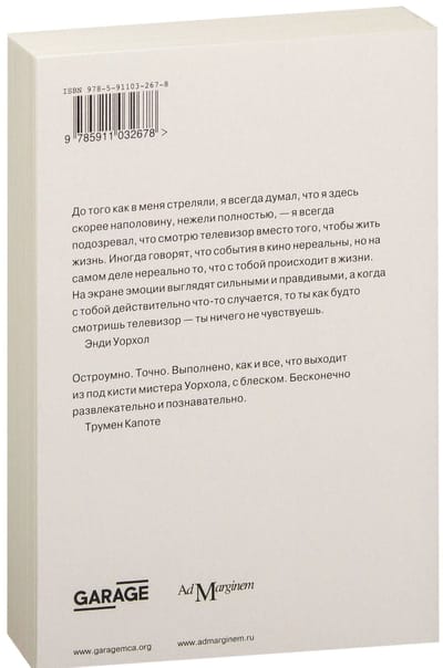 Andy Warhol (1928-1987) was an iconic American artist, director, producer, publisher, and one of the founders of Pop Art. In his autobiographical Philosophy, he shares his thoughts on fame, relationships, money, sex, food, fashion, work, time, New York City, and what it means to be modern. Unlike other artists' books, Warhol's manifesto is a literary work in which reflections on art are interspersed with memories of childhood, and dialogues with the fictional B are full-fledged first-person narratives. All of this makes "Philosophy" another great pop work by an artist, created this time with words rather than paint.