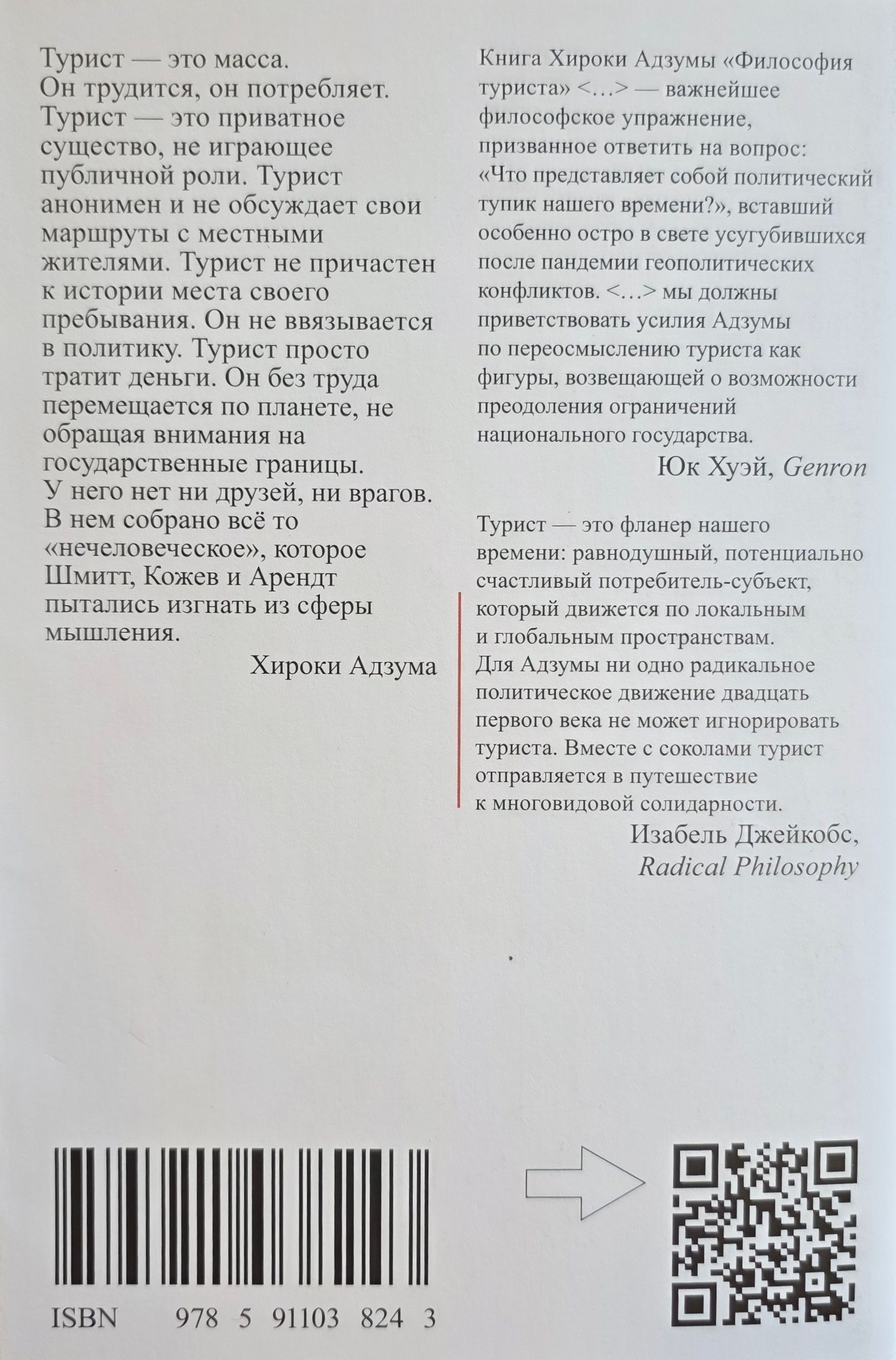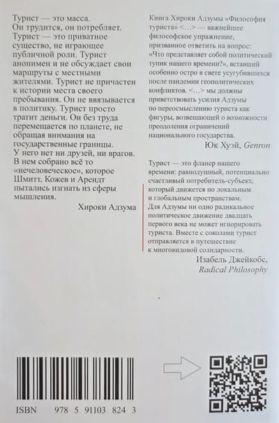 Independent Japanese philosopher and cultural critic Azuma Hiroki (b. 1971) sees in the figure of the tourist a metaphor for the Other, a symbol of incompleteness, chance and openness – a way of being that can become a response to the challenges of a world where globalization and nationalism do not so much oppose each other as strangely coexist; a world of crisis of the public and private, one’s own and someone else’s… In line with the very subject of the study, the author refuses to try to build a homogeneous theory, but combines philosophical analysis, essays, mathematics, trips to Chernobyl and observations of everyday life. Through reflections on tourism, family, the phenomenon of the “uncanny”, secondary creativity, interfaces and Dostoevsky, Azuma builds a speculative map of modernity, where chance becomes not a threat, but a condition for the birth of something new. “The Philosophy of the Tourist” is not a book “about the tourist”, but a book that invites us to think “like a tourist”: freely and informally, for the sake of a new understanding of solidarity.