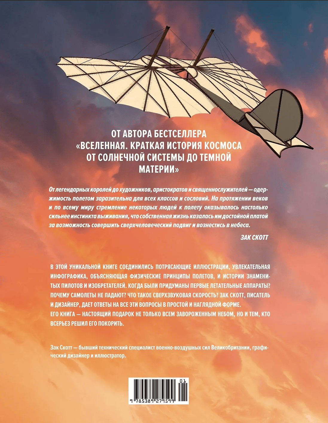 Mankind has dreamed of flying since the beginning of history. Zack Scott's book lifts the curtain on the miracle that accompanies us every day - the curtain on the world of aviation. Each page, supplied with unique author's illustrations, amazing infographics and visual diagrams, explains the principles of the design of all aircraft from the first gliders to modern copters. The reader will learn how to lift an airplane into the air and land it correctly, how lift occurs and what laws of physics allow a person to fly.