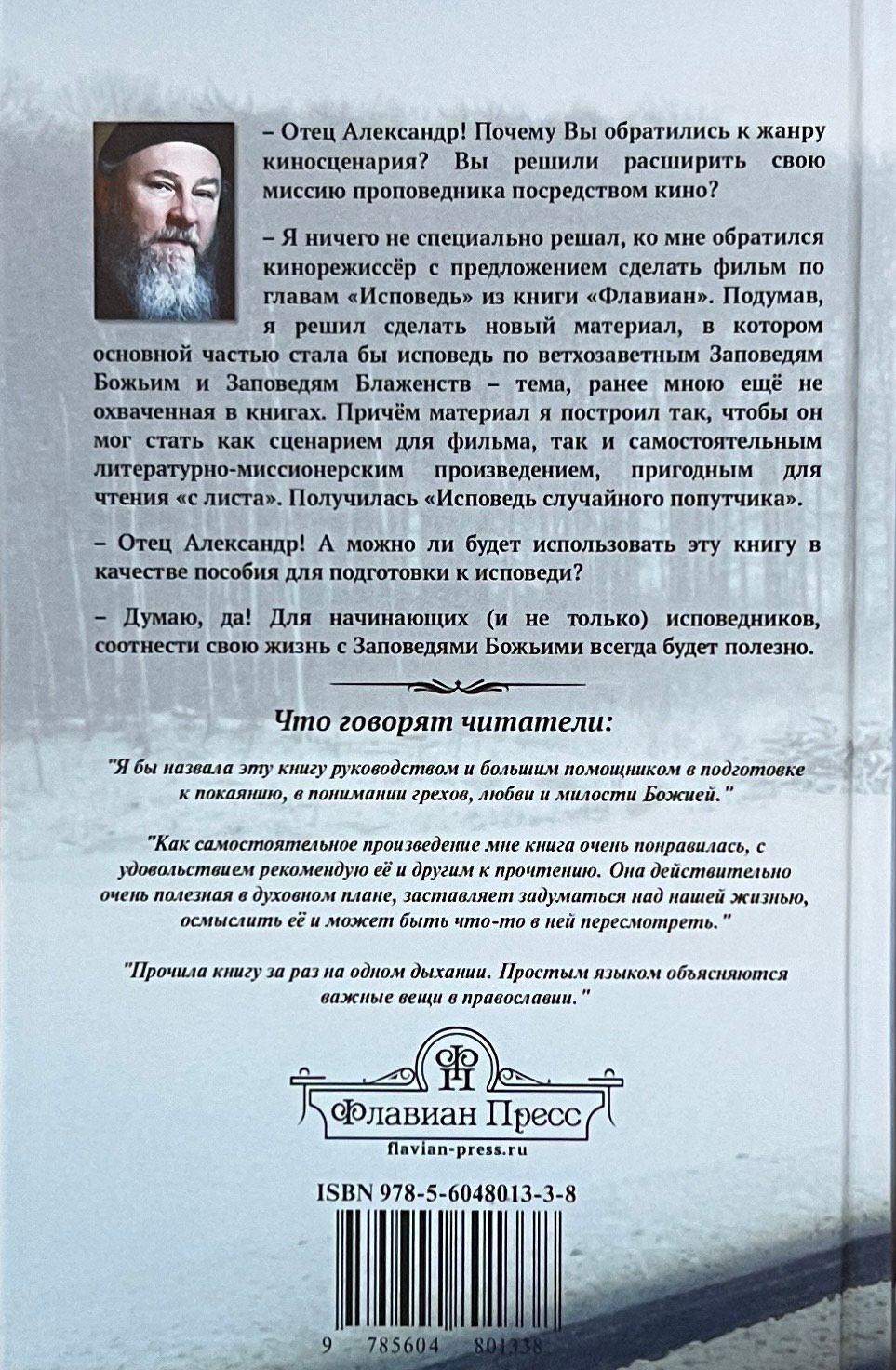 Archpriest Alexander Torik's book "Flavian. Confession of an Accidental Traveler" is written in the genre of a screenplay. The protagonist of the work, waiting for the birth of a child for the first time in his life confesses the Old Testament Commandments of God and the Commandments of the Beatitudes, and Father Flavian helps him in this.