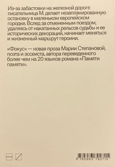 Because of a railroad strike, writer M. makes an unscheduled stop in a small European town. Following the canceled train, moving away from the rolled rails of fate and its historical scenery, begins to change and the life route of the heroine. "Focus" - a new prose Maria Stepanova, poet and essayist, author of the novel "Memory of Memory" translated into more than 20 languages.