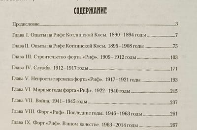 The book by V.F. Tkachenko tells the story of the construction and operation of one of the defensive structures of the Kronstadt fortress. Built on the western end of Kotlin Island, Fort Reef played an important role in the defense of Petrograd-Leningrad during the Civil and Great Patriotic Wars and was used for many decades - until 2014 - by the Coastal Defense of the Baltic Fleet.
