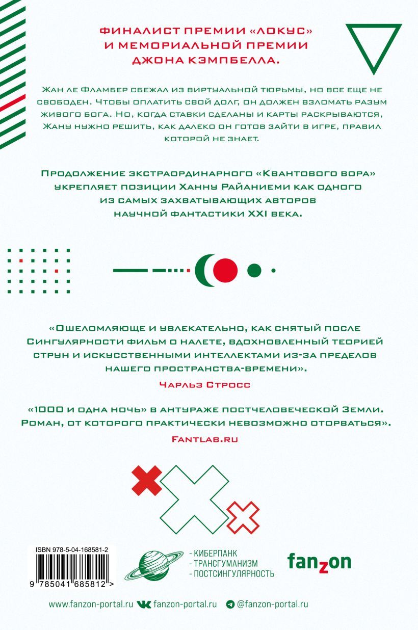 Nominated for the John Campbell Memorial Award, the World of Fiction Magazine's Outcome of the Year Awards, and Best Books by SF Site. Jean le Flambert has escaped from a virtual prison, but he's still not free. To pay his debt, he must hack into and free the mind of a living god. But when the stakes are stacked, Jean must decide how far he's willing to go in this game to end it. The sequel to the extraordinary The Quantum Thief solidifies Hannu Raianiemi's position as one of the most exciting science fiction authors of the twenty-first century.