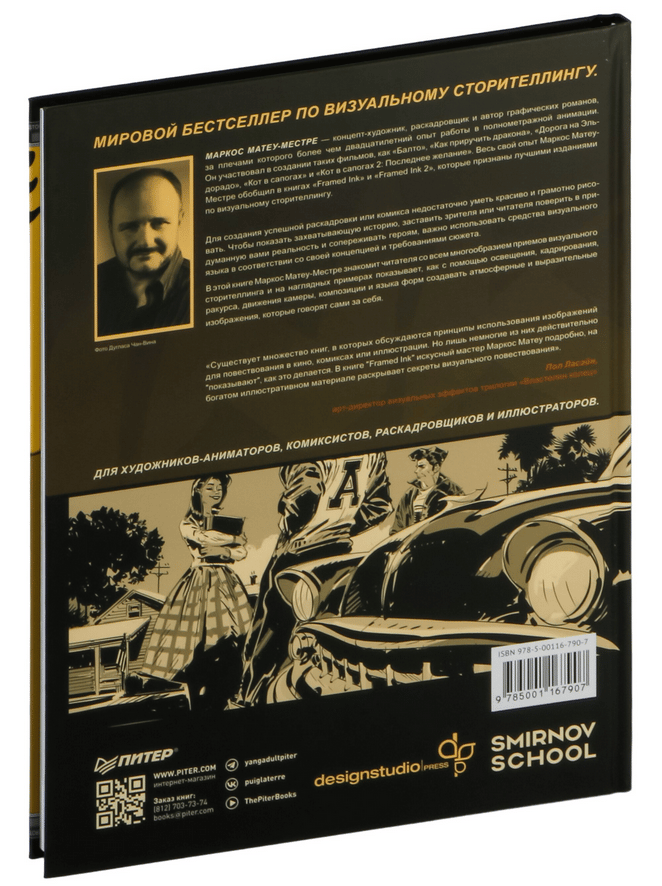 Marcos Mateu-Mestre is a concept artist, storyboard artist and author of graphic novels with over twenty years of experience in feature animation. He has contributed to such films as Balto, How to Tame the Dragon, The Road to Eldorado, Puss in Boots and Puss in Boots 2: The Last Wish. Marcos Mateu-Mestre summarized all his experience in the books "Framed Ink" and "Framed Ink 2", which are recognized as the best publications on visual storyboarding. To create a successful storyboard or comic book, it's not enough to be able to draw beautifully and competently. To show a compelling story, to make the viewer or reader believe in the reality you have invented and empathize with the characters, it is important to use the means of visual language according to your concept and the requirements of the story. In this book, Marcos Mateu-Mestre introduces the reader to the full range of visual storytelling techniques and shows with clear examples how to use lighting, framing, perspective, camera movement, composition and form language to create atmospheric and expressive images that speak for themselves. For animators, comic book artists, storyboard artists, and illustrators.