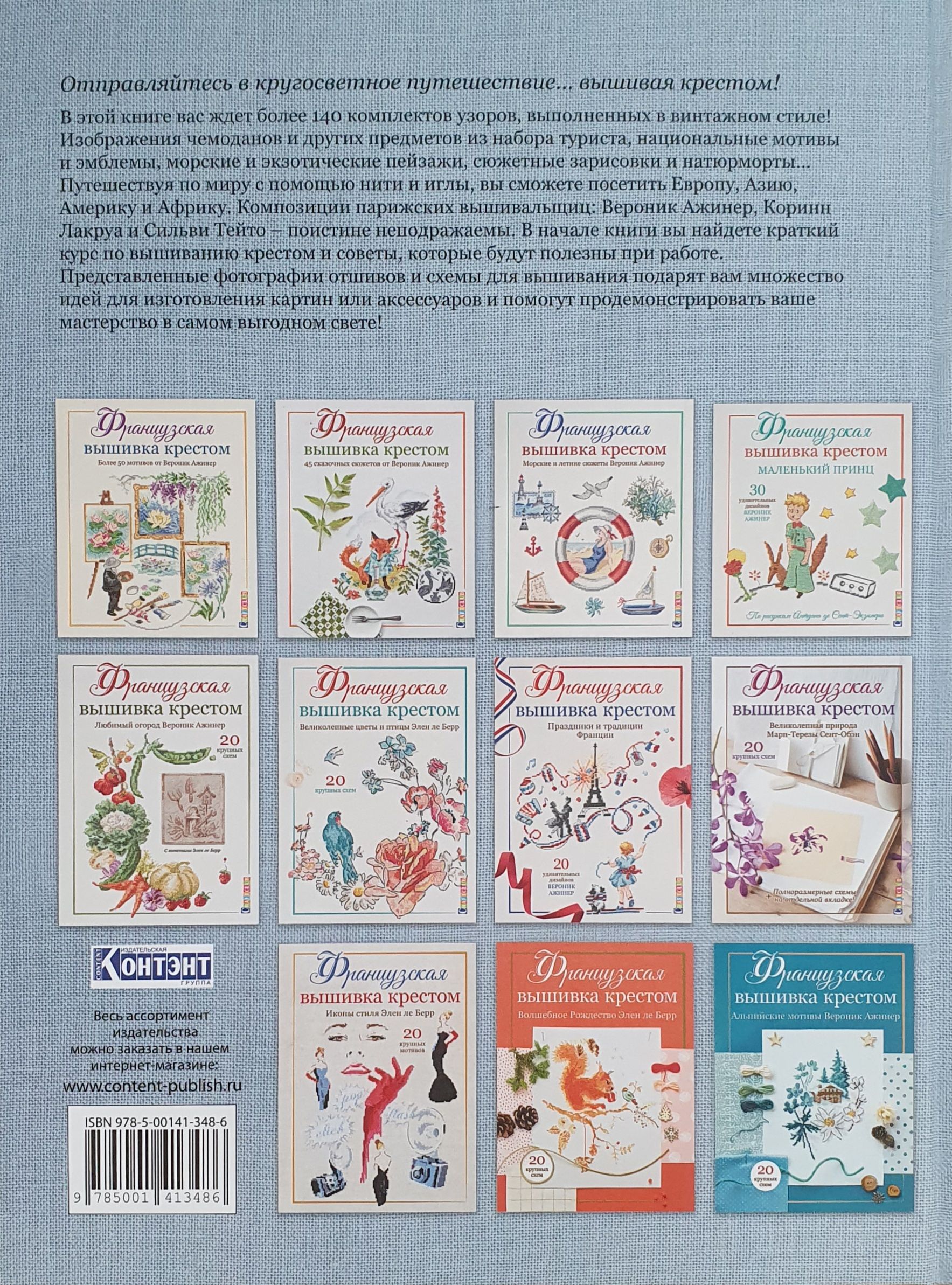 Take a trip around the world... embroidering with cross stitch! More than 140 sets of vintage-style patterns await you in this book! Images of suitcases and other items from the tourist kit, national motifs and emblems, marine and exotic landscapes, sketches and still lifes... Traveling around the world with a needle and thread, you can visit Europe, Asia, America and Africa. The compositions of Parisian embroiderers Veronique Aginer, Corinne Lacroix and Sylvie Teito are truly inimitable. At the beginning of the book you will find a short course in cross-stitch embroidery and tips that will be useful in your work. The embroidery photos and patterns will give you lots of ideas for making pictures or accessories and will help you show off your skills in the best possible light!