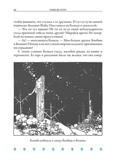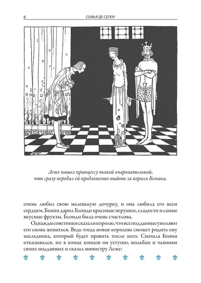 The book is decorated with illustrations by the talented American artist Virginia Frances Sterrett. Her drawings for "Old French Tales" for the American publishing house "Penn Publishing" became the first order, which Virginia received in 1920 after studying at the Art Institute of Chicago. Sterrett was a fan of the Art Deco style and tried to follow it in her work. In the drawings done for Segur's tales, this is immediately apparent. Sterrett spent her childhood in Chicago. At the beginning of XX century this city did not please the inhabitants with its beauty, and Virginia's drawings reminded some dreams about other, marvelous and alluring worlds, the images of which appeared in the artist's head. Sterrett was in poor health, and in her short but colorful life she managed to design only a few publications. Her last work was illustrations for the fairy tales of One Thousand and One Nights. She finished them in 1928. Critics wrote that Sterrett's drawings are distinguished by a "delicate, fantastic beauty, depicting which she must have escaped from the harsh realities of life".