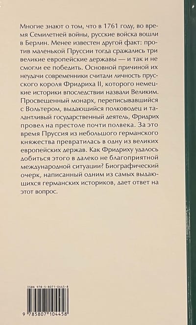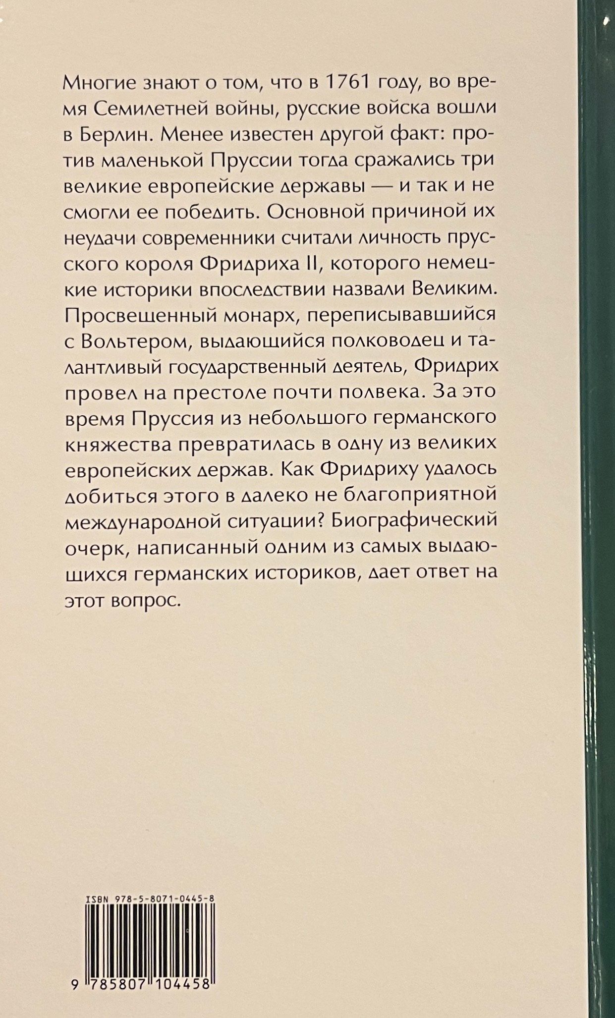 Many people know that in 1761, during the Seven Years' War, Russian troops entered Berlin. Less well-known is the fact that three great European powers were fighting against little Prussia at the time and were never able to defeat it. The main reason for their failure, contemporaries considered the personality of the Prussian king Frederick II, whom German historians later called the Great. An enlightened monarch who corresponded with Voltaire, an outstanding commander and a talented statesman, Frederick spent almost half a century on the throne. During this time, Prussia turned from a small German principality into one of the great European powers. How did Friedrich manage to achieve this in a far from favorable international situation? A biographical essay, written by one of the most prominent German historians, provides an answer to this question.