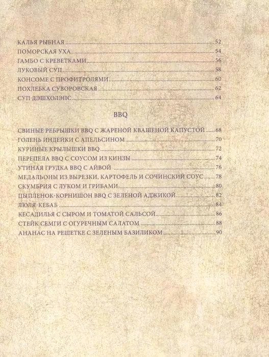 The barbecue section features recipes for dishes cooked over smoldering coals. Since this cooking method requires pre-marinating the ingredients, the authors paid special attention to marinades and serving sauces.