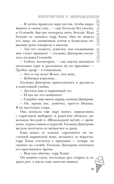 The witch Solveig has been collecting and cherishing other people’s dreams for four hundred years: small and large, unusual and most secret, giving eternal life in exchange for them. And in his spare time, he sells ice cream in a shop called “Transcar” in a friendly seaside town. Solveig’s life seems like a fairy tale, but is eternity so beautiful that there are no desires and hopes of its own? Asking this question, Solveig spends day after day until the north wind brings an unusual guest to the door of the Van - a salesman from England who dreams of trying the most delicious ice cream in the world.