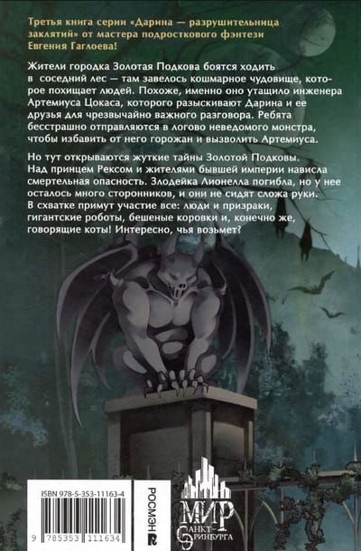 The third volume of the adventure series "Darina - the Spellbreaker" by Evgeny Gagloev - a recognized master of fantasy for children and teenagers. The novel "Ghosts of the Dark Gorge" expands the universe of St. Erinburg and introduces readers to new heroes, mysteries and investigations. Residents of the town of Zolotaya Podkova are afraid to go to the neighboring forest - a nightmarish monster has appeared there, which kidnaps people! It seems that it was the one that dragged away engineer Artemius Tsokas, who is wanted by Darina and her friends for an extremely important conversation. The guys will have to go to the lair of the unknown monster to rid the townspeople of it and rescue Artemius.