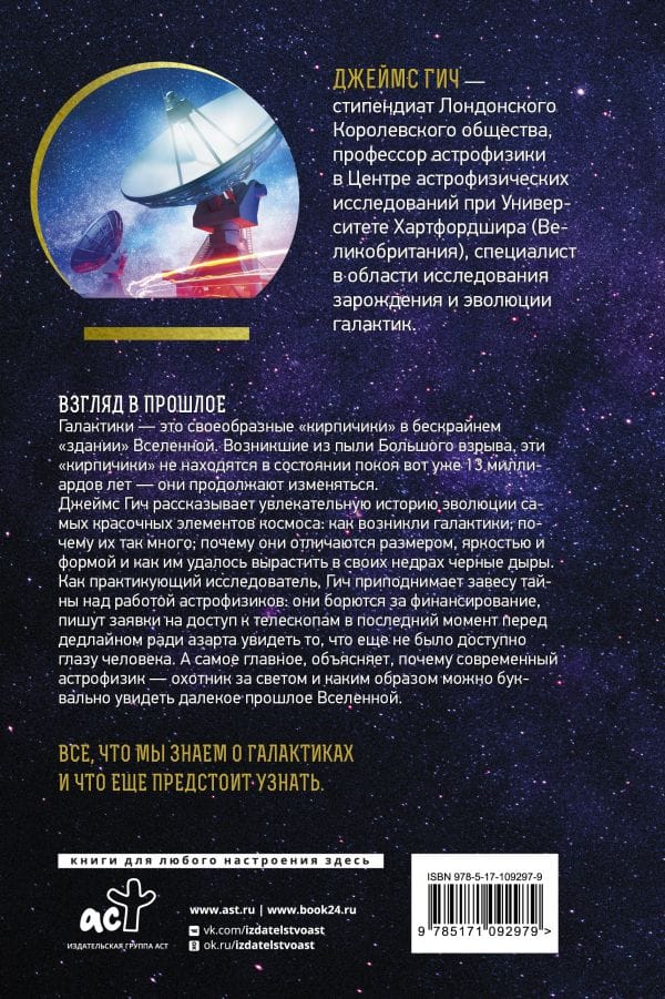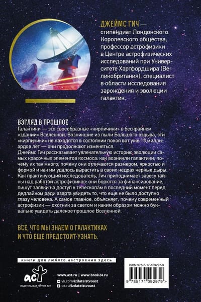 Galaxies are peculiar "bricks" in the vast "building" of the Universe. Emerging from the dust of the Big Bang, these "bricks" have not been at rest for 13 billion years - they continue to change. James Geach tells the fascinating story of the evolution of the most colorful elements of the cosmos: how galaxies came to be; why there are so many of them; why they differ in size, brightness, and shape; and how they managed to grow black holes in their interior. As a practicing researcher, Geach lifts the veil of secrecy over the work of astrophysicists: they compete for funding, write applications for access to telescopes at the last moment before the deadline for the excitement of seeing what has not yet been available to the human eye. And most importantly explains why the modern astrophysicist is a hunter of light, and how you can literally see the distant past of the universe.