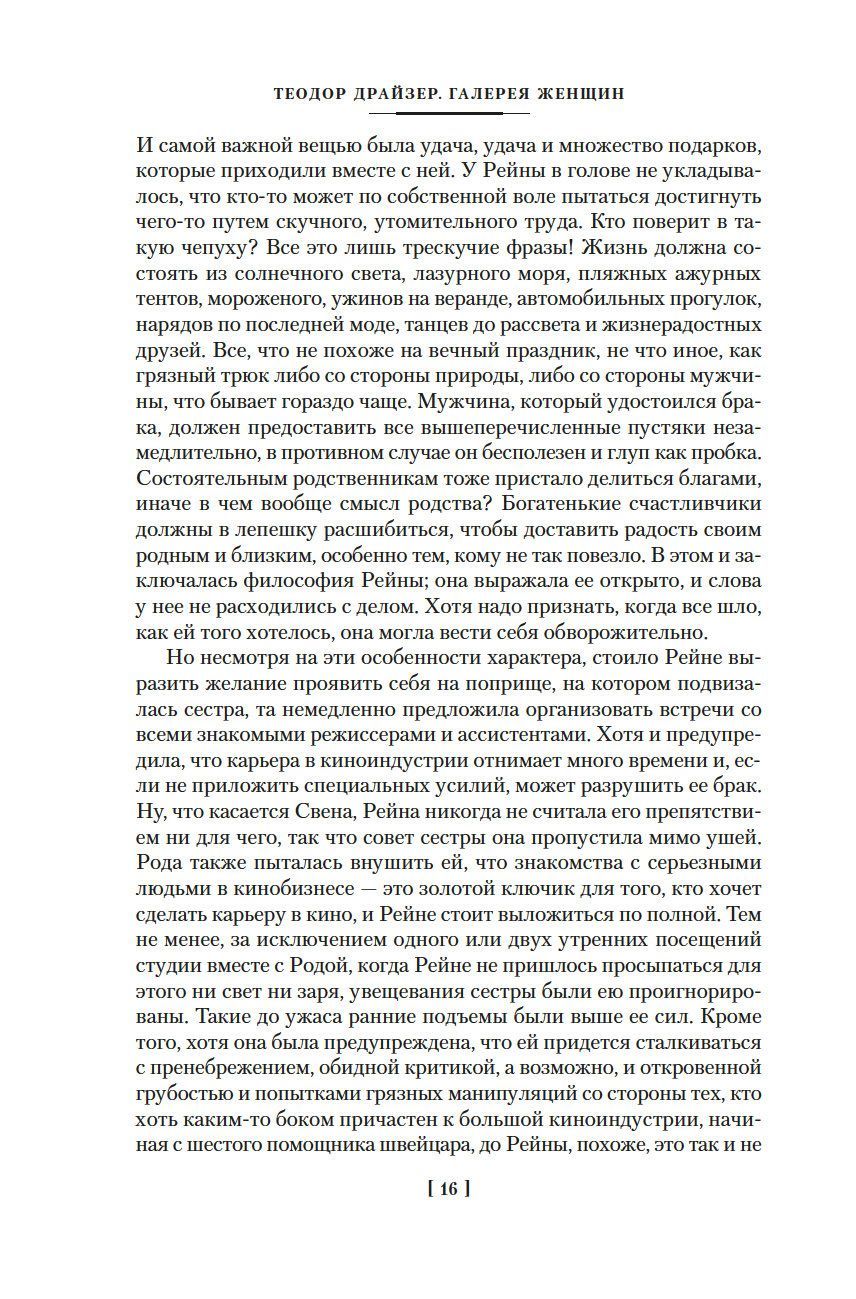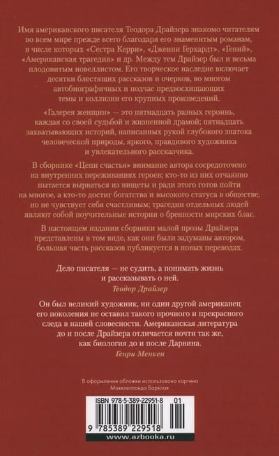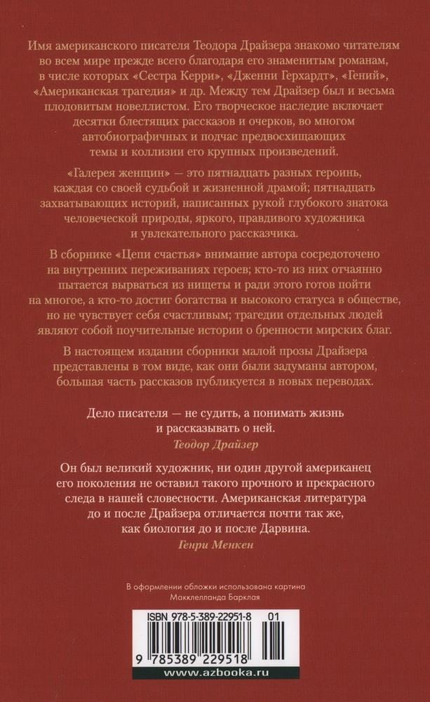 The name of the American writer Theodore Dreiser is familiar to readers around the world primarily due to his famous novels, including "Sister Carrie", "Jenny Gerhardt", "Genius", "An American Tragedy", etc. Dreiser was a very prolific novelist. Meanwhile, Dreiser was also a very prolific novelist. His creative legacy includes dozens of brilliant stories and essays, largely autobiographical and sometimes anticipating the themes and collisions of his major works. "Gallery of Women" - this is fifteen different heroines, each with their own fate and life drama, fifteen fascinating stories, written by the hand of a profound connoisseur of human nature, bright, truthful artist and fascinating storyteller. In the collection "Chains of Happiness" the author's attention is focused on the inner feelings of the characters; some of them are desperately trying to escape from poverty and for the sake of this is ready to go to a lot, and someone has achieved wealth and high status in society, but does not feel happy, the tragedies of individuals are cautionary tales about the frailty of worldly goods. In this edition, Dreiser's collections of short prose are presented as they were conceived by the author, and most of the stories are published in new translations.