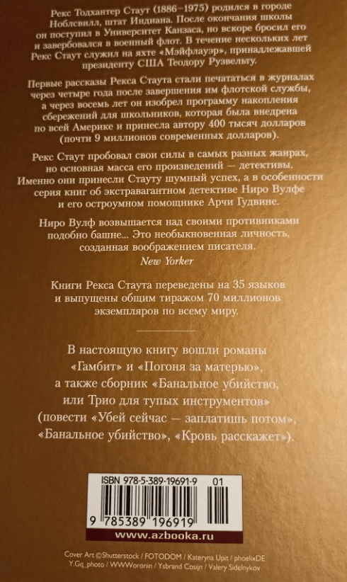 Niro Wolfe, a passionate orchid collector, a great gourmet, a beer lover and a great detective, almost never leaves the house. He unravels all crimes based on the facts that Archie Goodwin, his charming, ironic assistant with an excellent memory, collects. At an elite chess club, talented chess player Paul Gerin is poisoned during a simultaneous play session, and suspicion falls on one of the participants. However, his daughter is sure of her father's innocence and asks Wolfe to find the real killer... Lucy Weldon, the widow of a successful writer, is planted with a baby with a note saying that the father of this baby is her late husband. Lucy hires a famous detective to find the baby's mother. But it was worth Wolfe to start the search, as killed the main witness ... In addition to the novels "Gambit" and "The Chase for the mother", the book includes three novels in which Wolfe takes up the investigation to prove the innocence of the shoe shiner, to remove the charges from Archie, who was framed by his acquaintance, and at the same time once again to tell the police that she goes on the wrong trail.