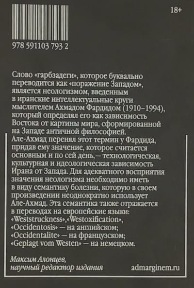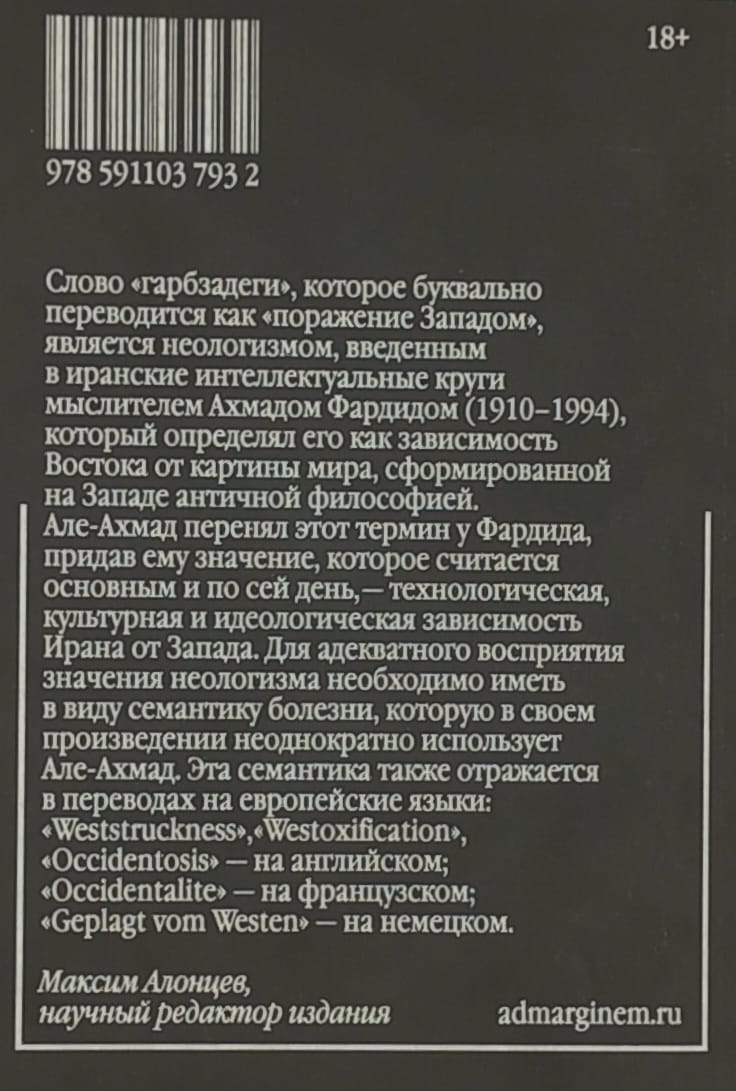 Jalal Ale-Ahmad’s (1923–1969) controversial essay has gained worldwide fame and has been translated into many languages. It examines Iran’s internal problems through the prism of the country’s unequal relations with the West. The term “garbzadegi,” literally translated from Farsi as “defeat by the West,” was adopted by Ale-Ahmad from the Iranian thinker Ahmad Fardid and given to it a meaning that has become central: Iran’s technological, cultural, and ideological dependence on the West. The essay has been mistakenly interpreted as an Islamist text, but “garbzadegi” criticizes colonialism, not progress as such. Today, when the confrontation between the ideologies of globalism and anti-globalism remains relevant, and questions of the search for a post-colonial national identity remain sensitive, Ale-Ahmad’s work will be of interest to a wide range of readers.