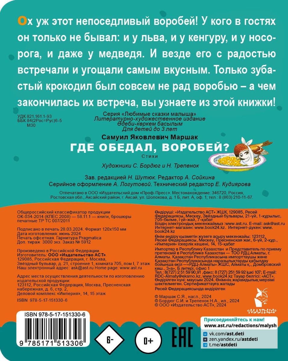 Samuel Yakovlevich Marshak is a classic of Russian children's literature. His poem "Where did you have lunch, sparrow?" is especially liked by young readers, because it is funny, rhythmic and easy to memorize. And also in this book each phrase of the poem corresponds to an illustration, and the story can be traced through the pictures. This book is designed specifically for kids: it has bright pictures and large letters, dense cardboard will not tear when reading, and rounded corners will not hurt little fingers.
