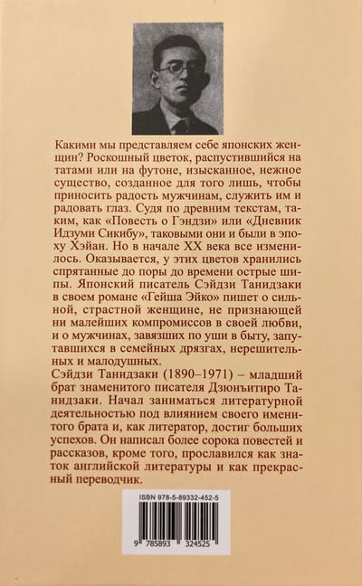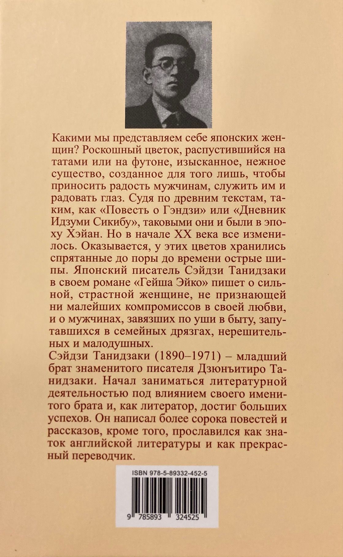 How do we imagine Japanese women? A luxurious flower blooming on a tatami or a futon, an exquisite, delicate creature created only to bring joy to men, to serve them and to please the eye. According to ancient texts such as The Tale of Genji or The Diary of Izumi Shikibu, this is what they were like in the Heian period. But at the beginning of the 20th century, everything changed. It turns out that these flowers had sharp thorns hidden until then. The Japanese writer Tanizaki Seiji in his novel Geisha Eiko writes about a strong, passionate woman who does not recognize the slightest compromise in her love, and about men who are stuck up to their ears in everyday life, entangled in family squabbles, indecisive and cowardly. Tanizaki Seiji (1890–1971) was the younger brother of the famous Tanizaki Junichiro. He began his literary career under the influence of his famous brother and achieved great success as a writer. He wrote more than forty stories and short stories, and was also famous as an expert in English literature and as an excellent translator.