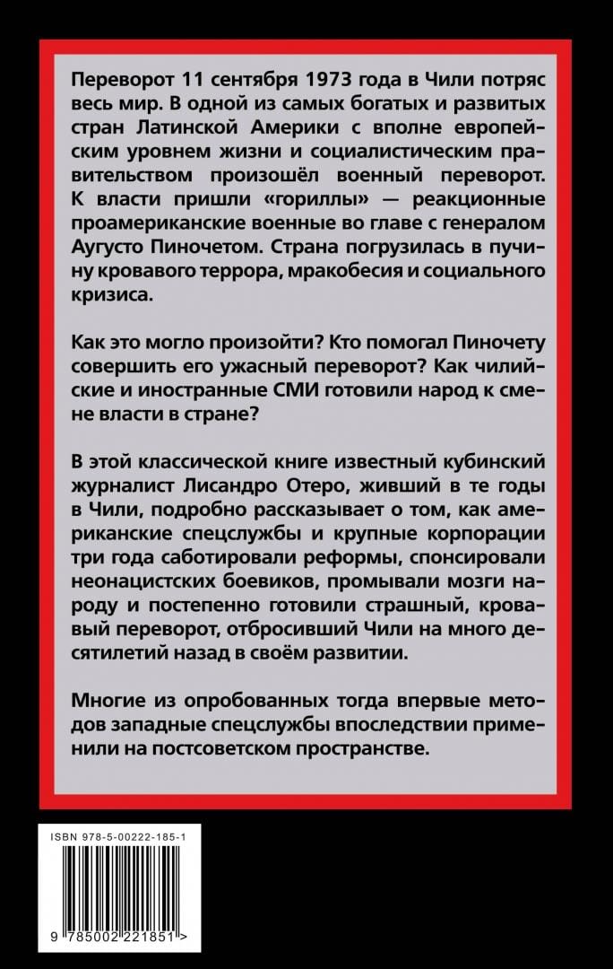 How could this have happened? Who helped Pinochet carry out his horrific coup? How did the Chilean and foreign media prepare the people for a change of power in the country? In this classic book, renowned Cuban journalist Lisandro Otero, who lived in Chile during those years, details how U.S. intelligence agencies and major corporations spent three years sabotaging reforms, sponsoring neo-Nazi militants, brainwashing the people, and gradually preparing a terrible, bloody coup that set Chile back many decades in its development. Many of the methods that were tried for the first time at that time were subsequently applied by Western security services in the post-Soviet space.