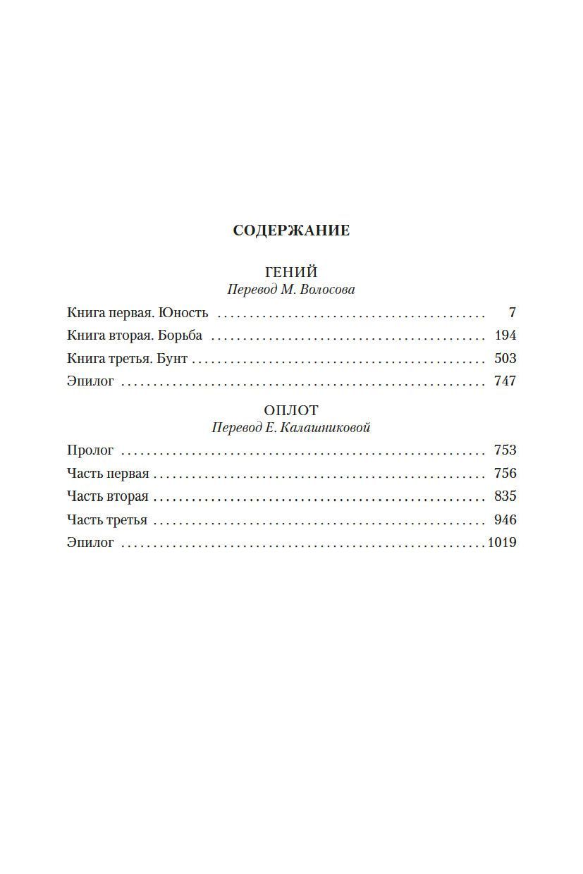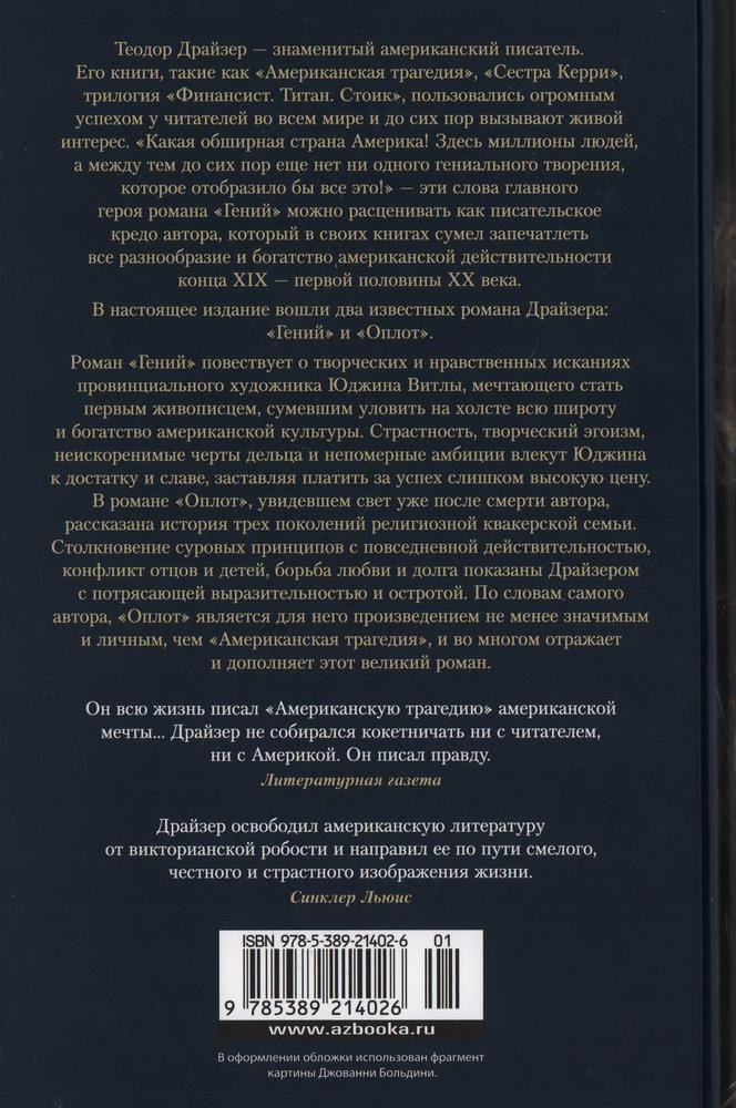 Theodore Dreiser is a famous American writer. His books such as "American Tragedy", "Sister Carrie", trilogy "The Financier. Titan. Stoic", enjoyed great success with readers around the world and still arouses keen interest. This edition includes two famous novels Dreiser: "Genius" and "Oplot". The novel "Genius" tells about the creative and moral quest of provincial artist Eugene Vitla, dreaming of becoming the first painter who was able to catch on the canvas of the breadth and richness of American culture. Passion, creative egoism, ineradicable traits of a businessman and exorbitant ambition attract Eugene to wealth and fame, making him pay too high a price for success. The novel "Oplot", which was published after the author's death, tells the story of three generations of a religious Quaker family. The collision of harsh principles with everyday reality, the conflict of fathers and children, the struggle of love and duty shown by Dreiser with stunning expressiveness and poignancy. According to the author himself, "Oplot" is for him a work no less significant and personal than "American Tragedy", and in many ways reflects and complements this great novel.