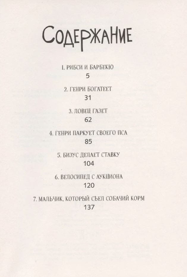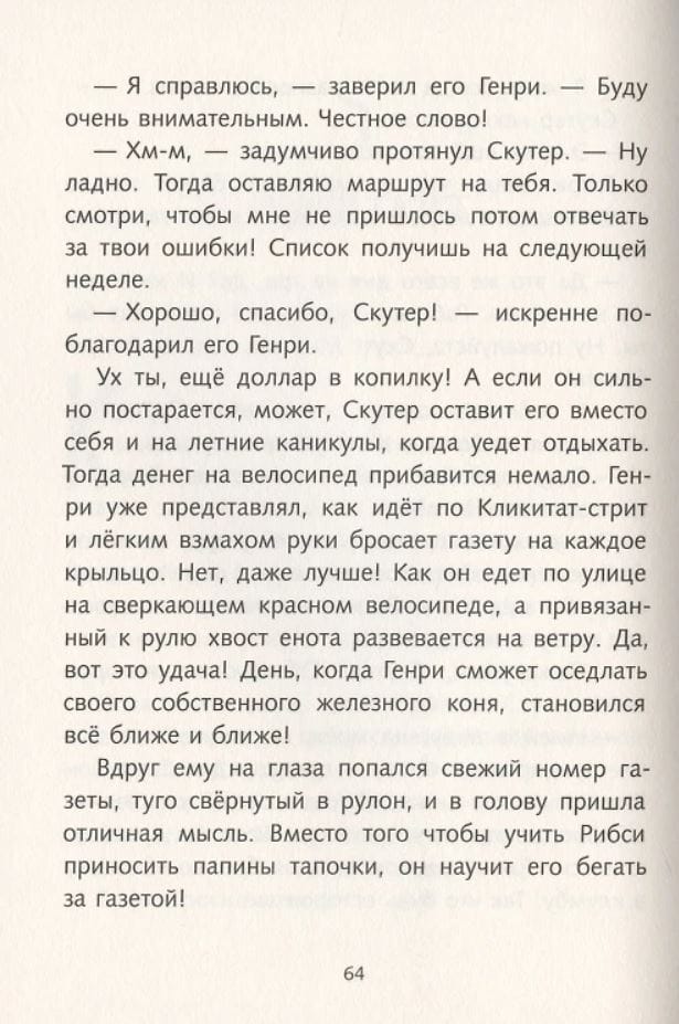 The book has seven stories. In the first, Ribsey steals a piece of meat that the Huggins neighbour Mr Grumby brought into the barbecue garden. Only Scooth on his bike was able to catch up with the fugitive, and then Henry firmly decides to save for a bicycle. In the second story, Henry finds boxes of inflatable gum in the wasteland and realizes that this is a great chance to get rich. However, the gum trade at school, which at first goes very briskly, soon turns into a conversation with the headmaster and other troubles. In the third story, Henry is called upon to deliver newspapers in place of Scoot, who leaves for a three-day scout camp. But first he'll have to stop Ribsey from dragging papers! In the fourth story, Henry binds Ribsey to a parking lot, and the dog receives a ticket for improper parking. In the fifth story, Beezus bets on the wrong bike. In the sixth, Henry tries to turn a girl's bike into a boy's bike. In the seventh - together with Bizus, he goes to the opening of a department store, where he wins coupons to a beauty salon and tries dog food out of despair.