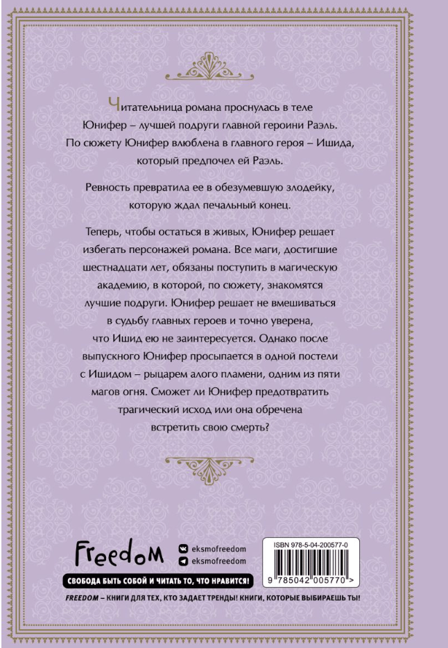 Now, to stay alive, Unifer decides to avoid the characters in the novel. All mages who have reached the age of sixteen are required to enroll in a magical academy, where the plot has the best friends meet. Unifer decides not to interfere in the fate of the main characters and is definitely sure that Ishid will not be interested in her. However, after graduation, Unifer wakes up in the same bed with Ishid, a knight of the scarlet flame, one of the five fire mages. Can Unifer prevent a tragic outcome or is she doomed to meet her death?